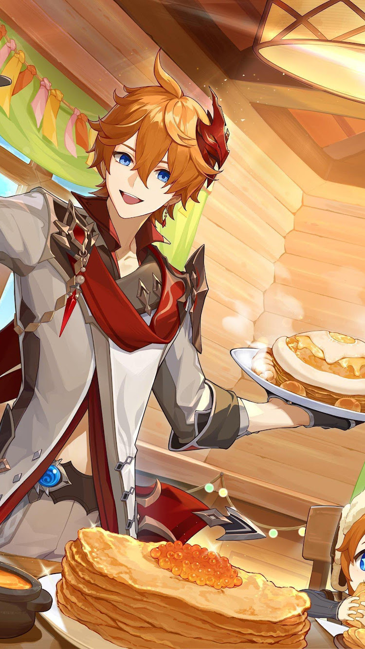 Genshin Impact, Childe, Pancakes, Anime 4K Desktop and Mobile Wallpaper Background with a maximum resolution of 4096x2304 px.
