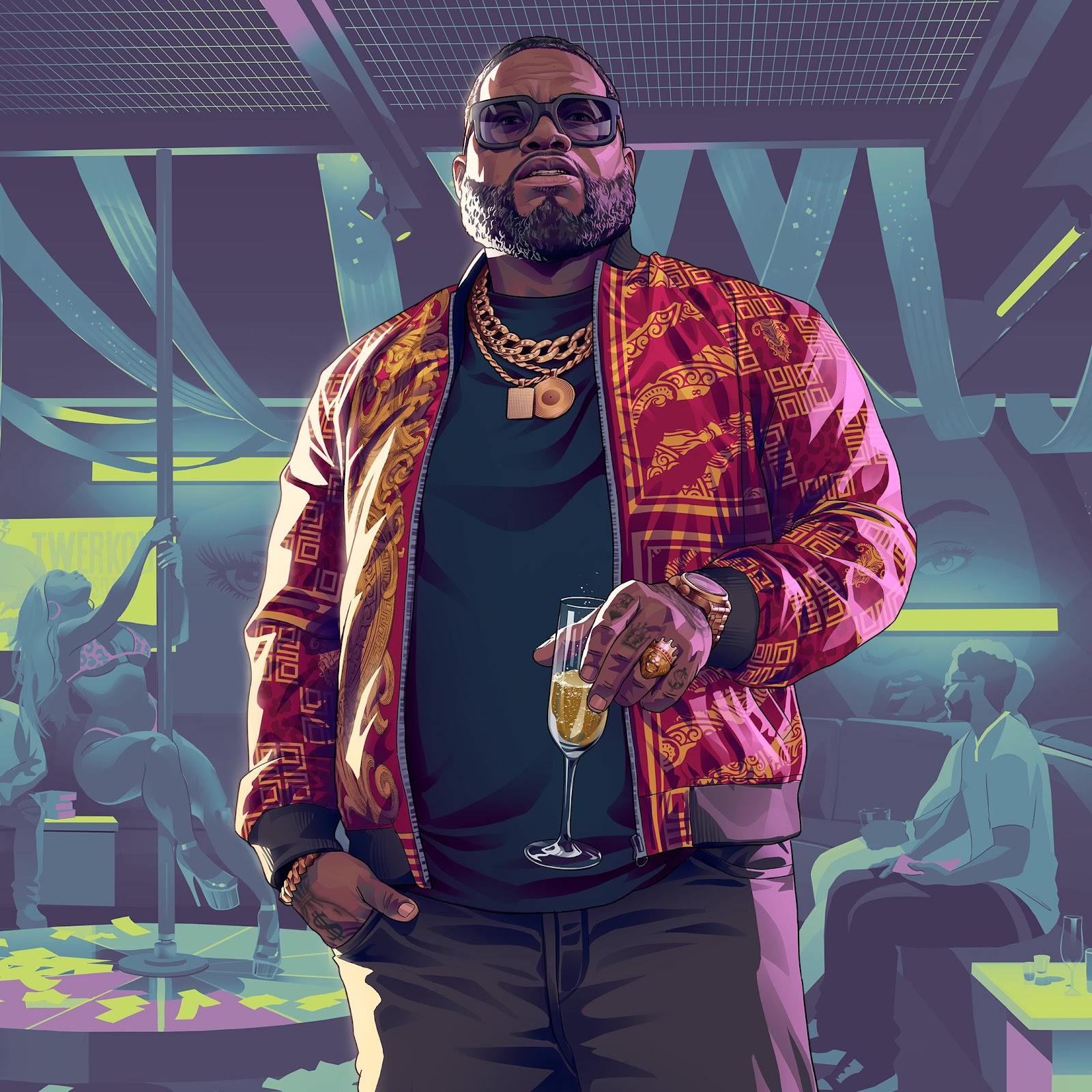 Grand Theft Auto, Nightclub, Illustration, Cartoon 4K Desktop and Mobile Wallpaper Background with a maximum resolution of 3840x2160 px.