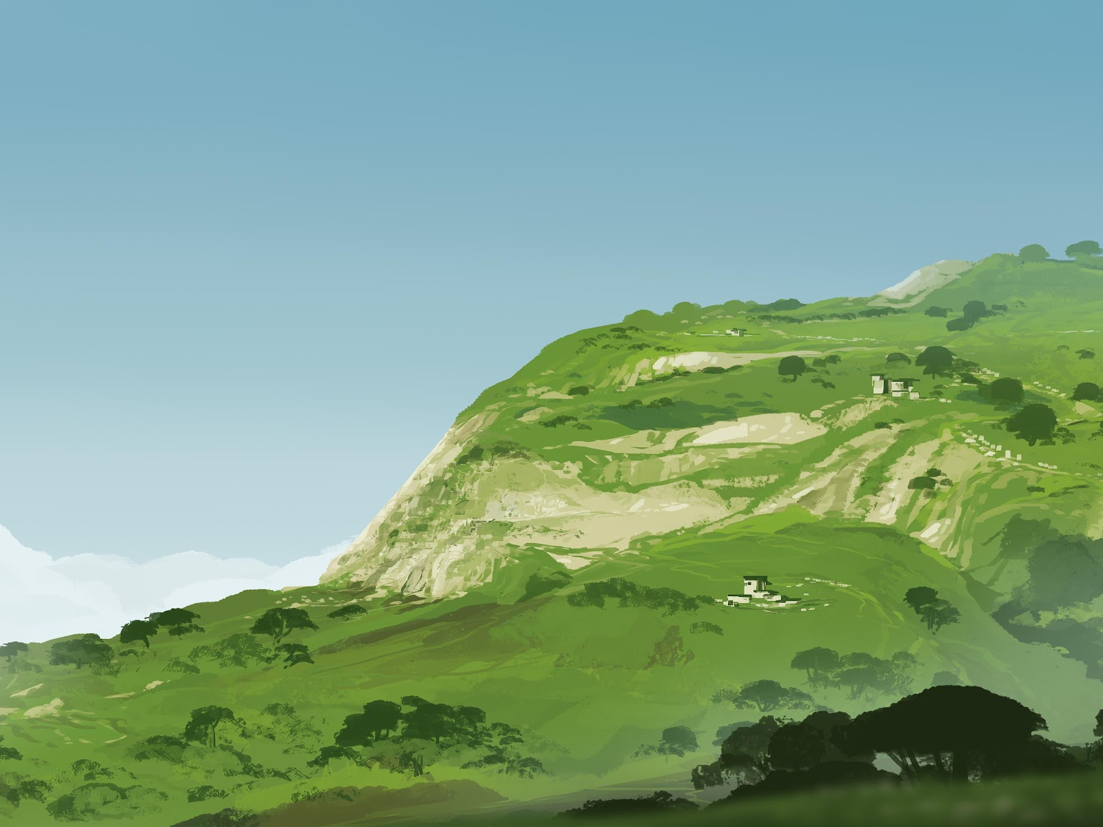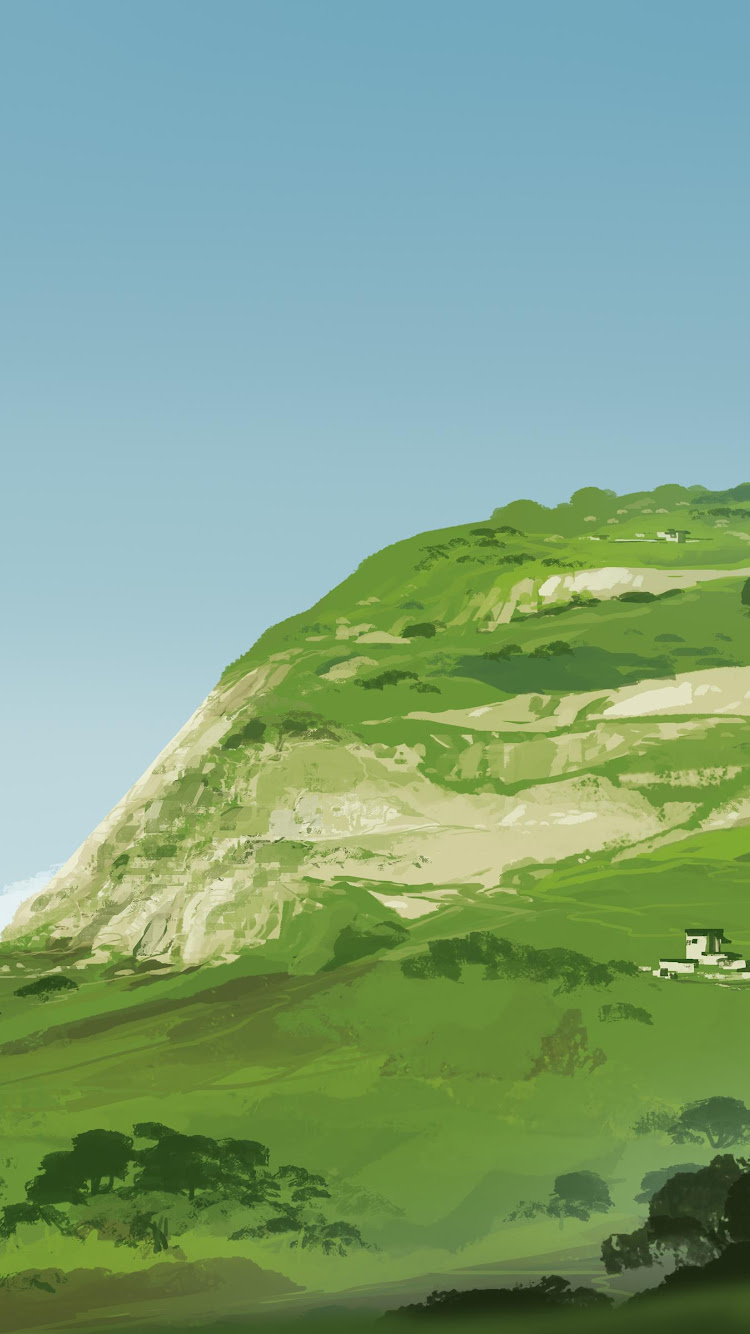 Green Landscape, Mountain Scenery, Digital Illustration, Nature Art 4K Ultrawide Desktop and Mobile Wallpaper Background with a maximum resolution of 5640x2400 px.