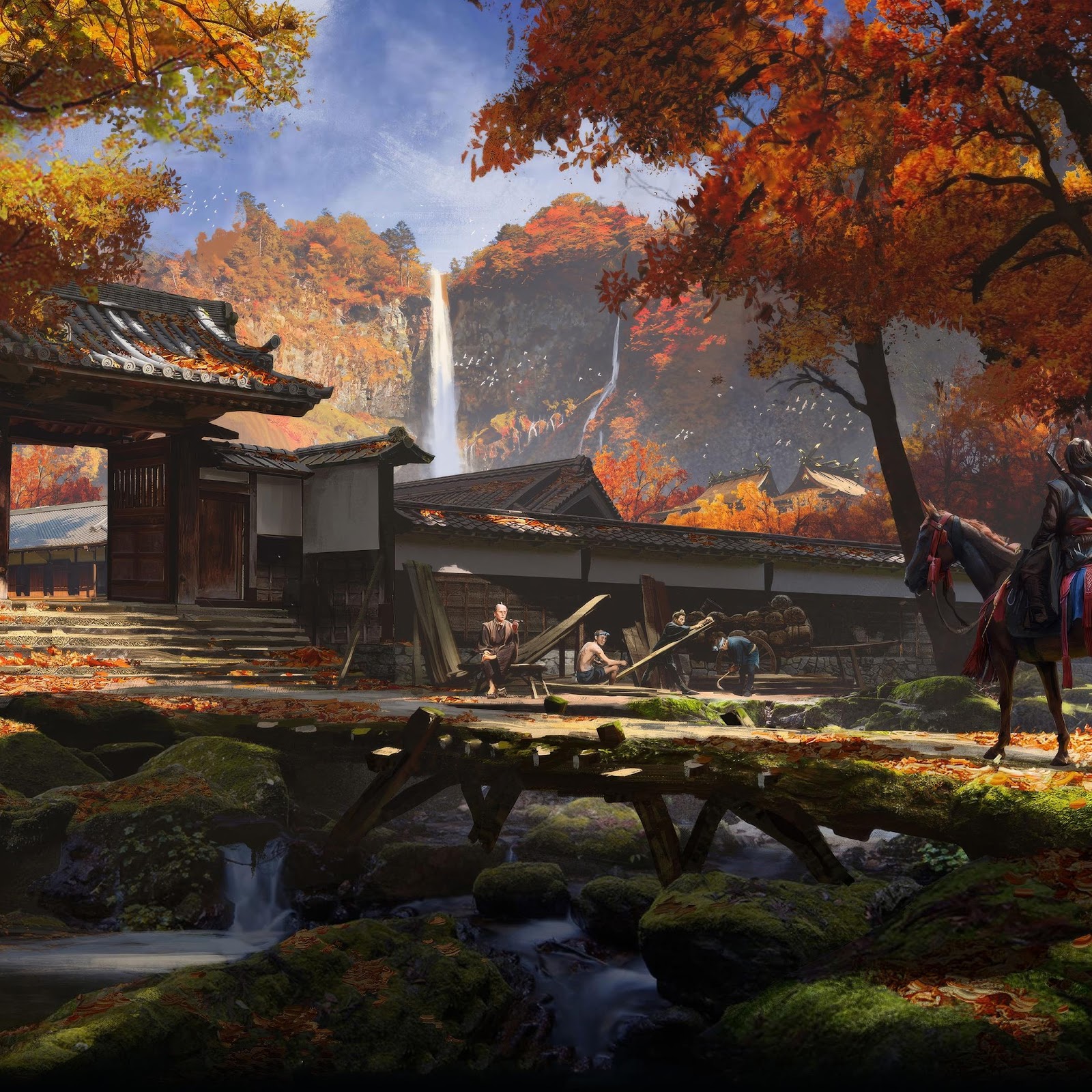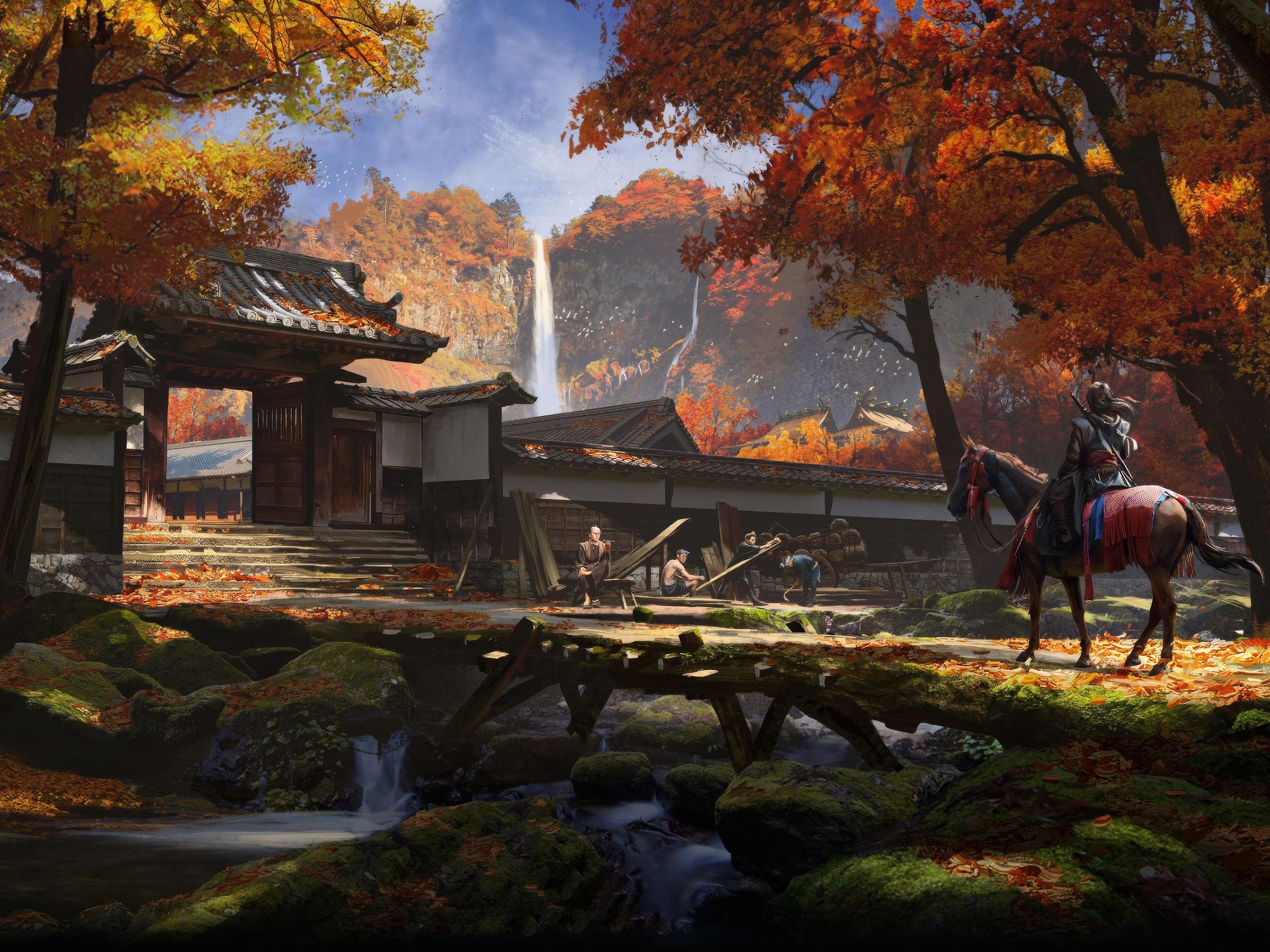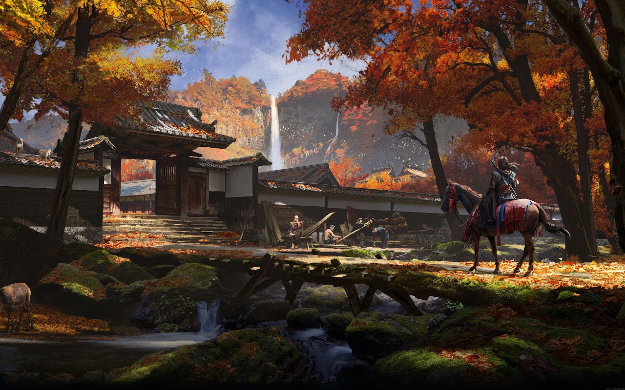Japanese Landscape, Autumn Foliage, Waterfall, Samurai 4K Desktop Wallpaper