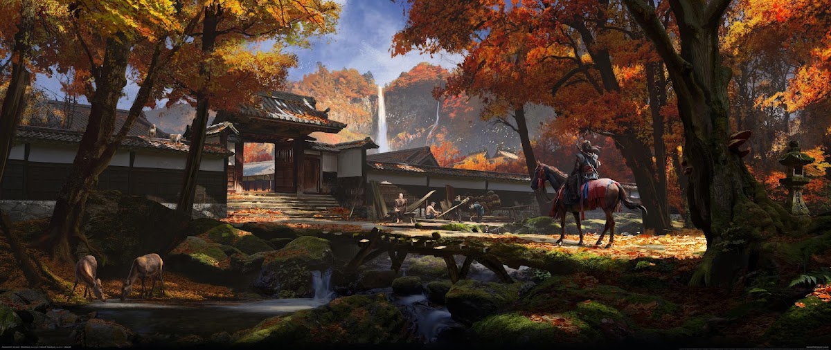 Japanese Landscape, Autumn Foliage, Waterfall, Samurai 4K Wallpaper Background (5120x2160)