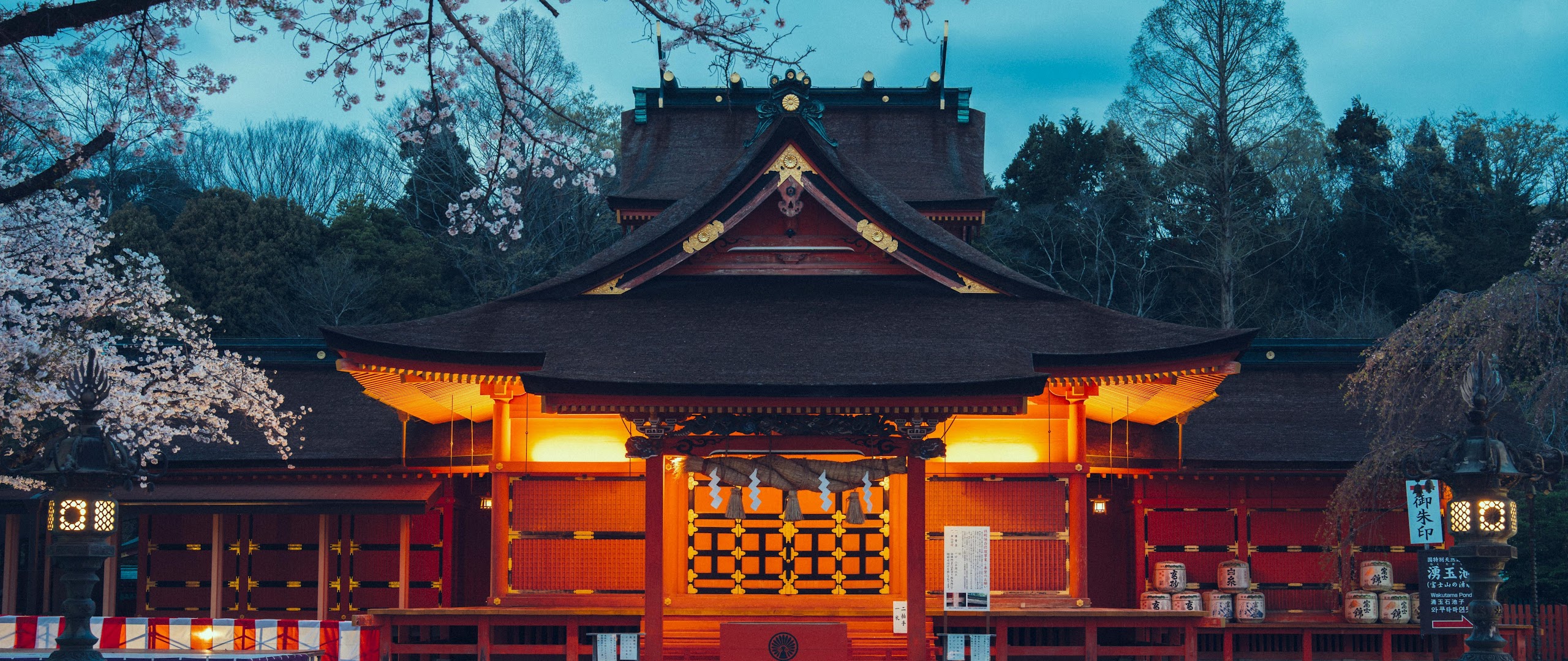 Japanese Shrine, Asian Architecture, Cherry Blossom, Religious Site 5K Desktop and Mobile Wallpaper Background with a maximum resolution of 6144x3828 px.