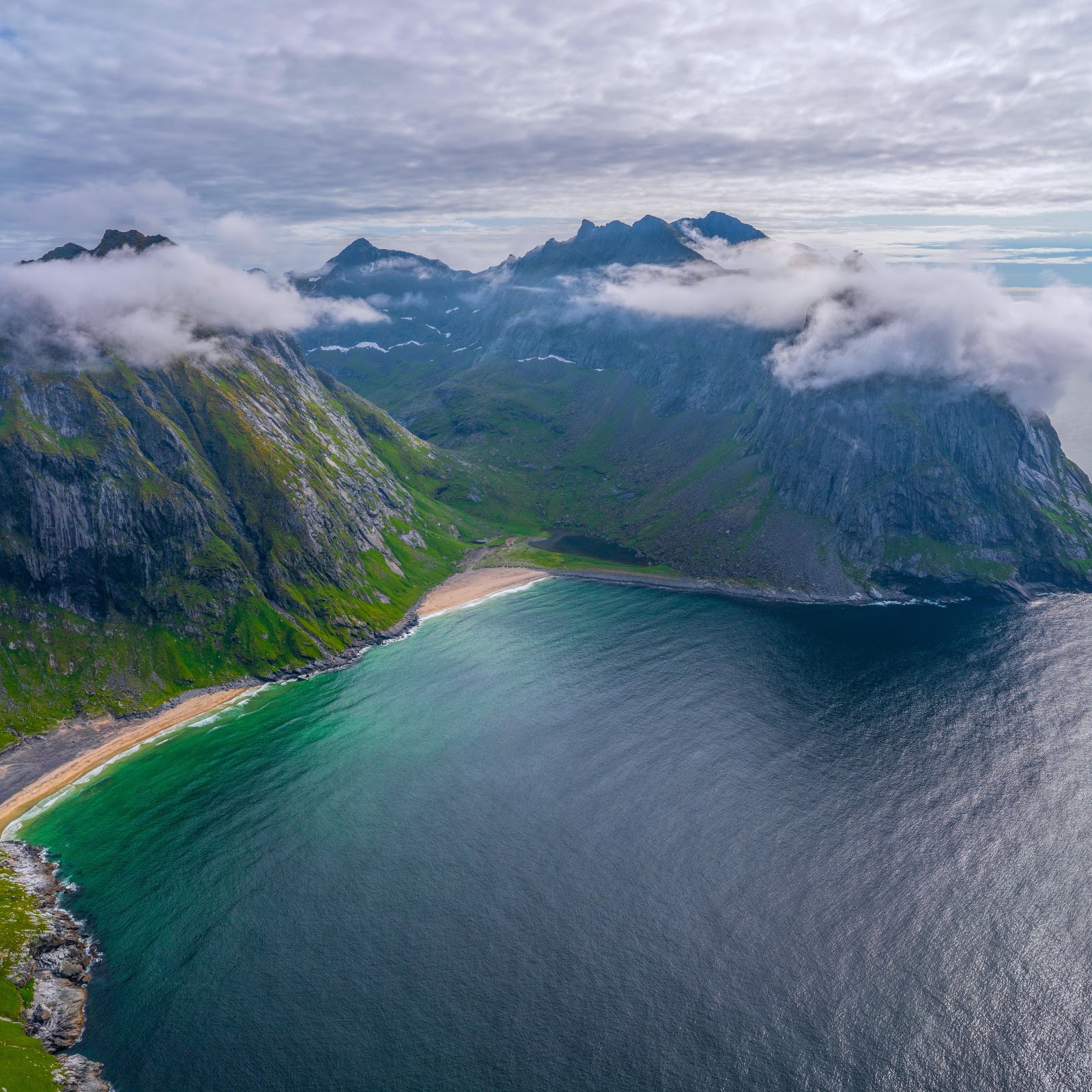 Lofoten Islands, Norway, Aerial View, Scenic Landscape 8K Desktop and Mobile Wallpaper Background with a maximum resolution of 7952x4654 px.