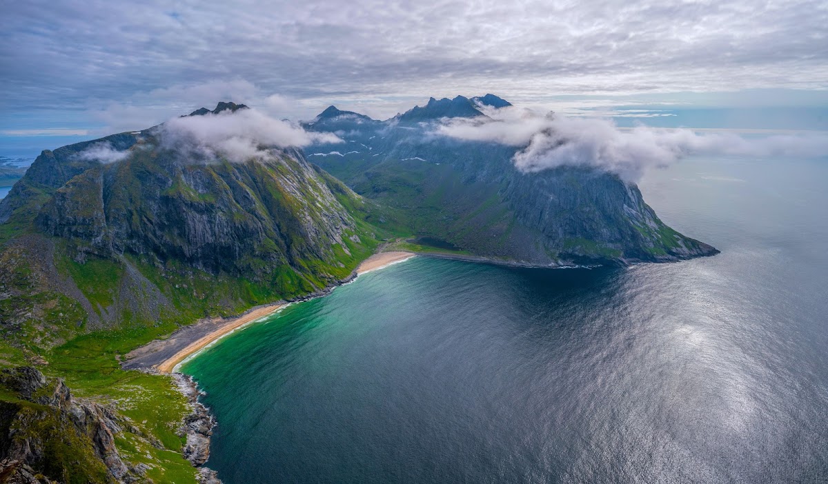 Lofoten Islands, Norway, Aerial View, Scenic Landscape 8K Desktop and Mobile Wallpaper Background with a maximum resolution of 7952x4654 px.