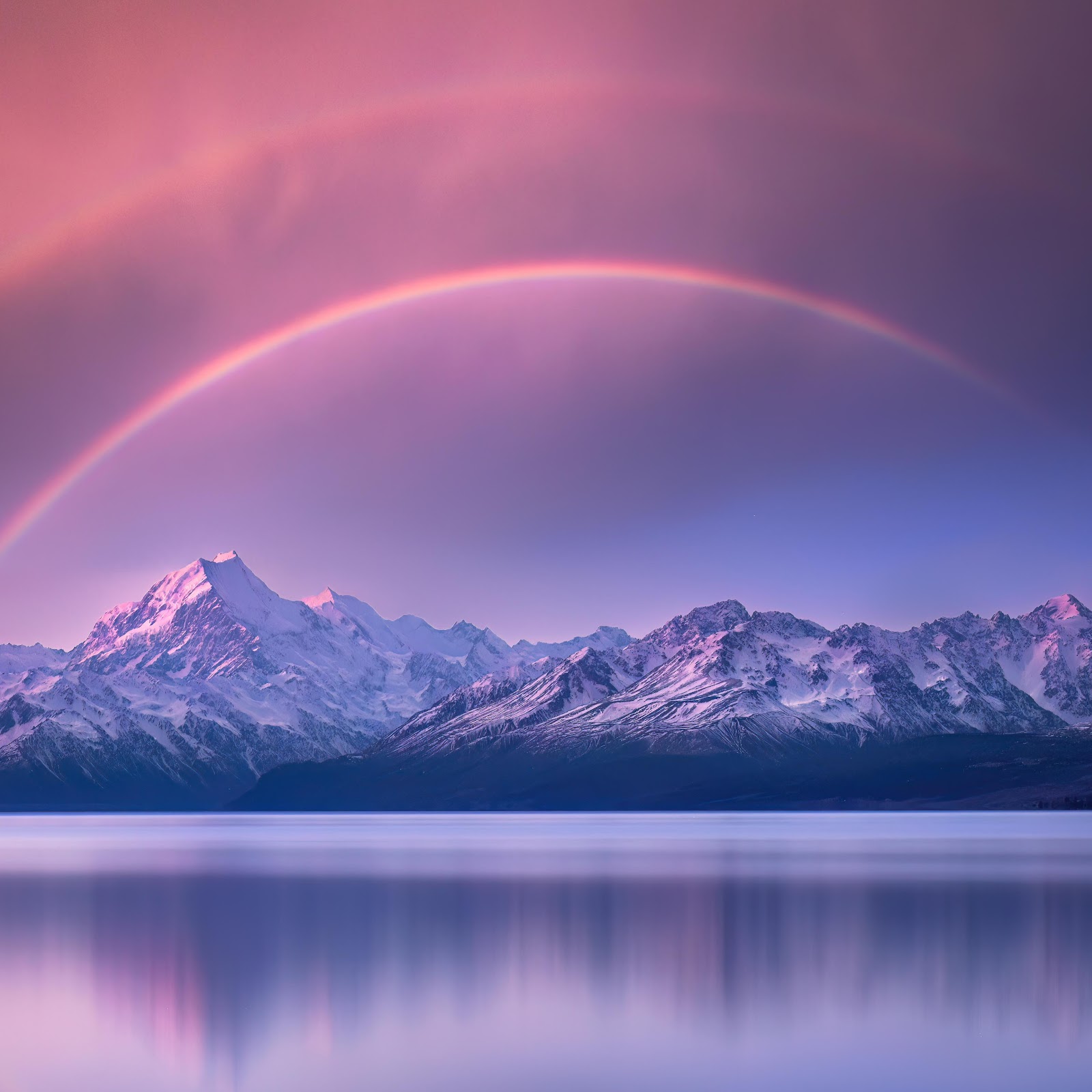 Mountain Landscape, Rainbow, Lake, Reflection 4K Desktop and Mobile Wallpaper Background with a maximum resolution of 5000x3320 px.