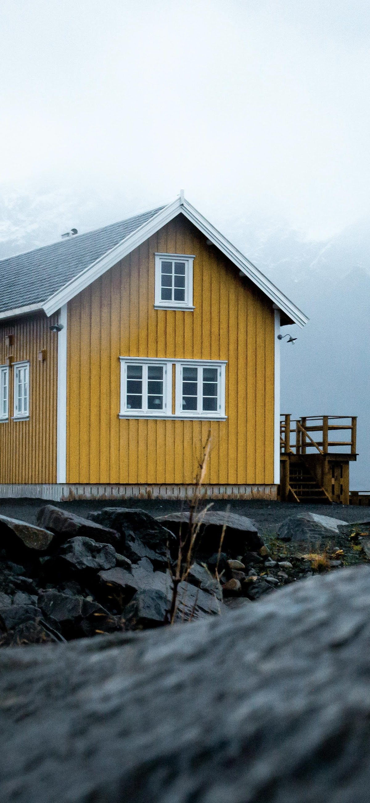Scandinavian Architecture, Yellow House, Coastal Living, Lofoten Islands 2K iPhone Wallpaper Background with a maximum resolution of 1656x3589 px.