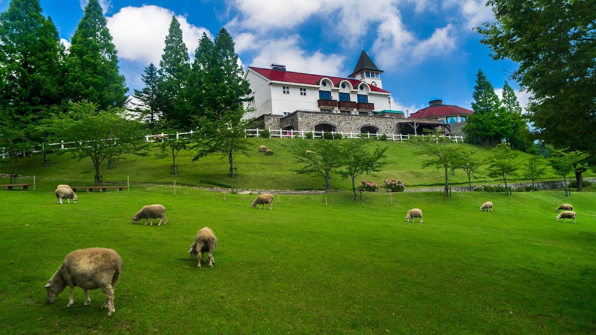 Scenic Landscape, Sheep Farm, Rolling Hills, European Architecture 5K Desktop and Mobile Wallpaper Background with a maximum resolution of 5940x3341 px.