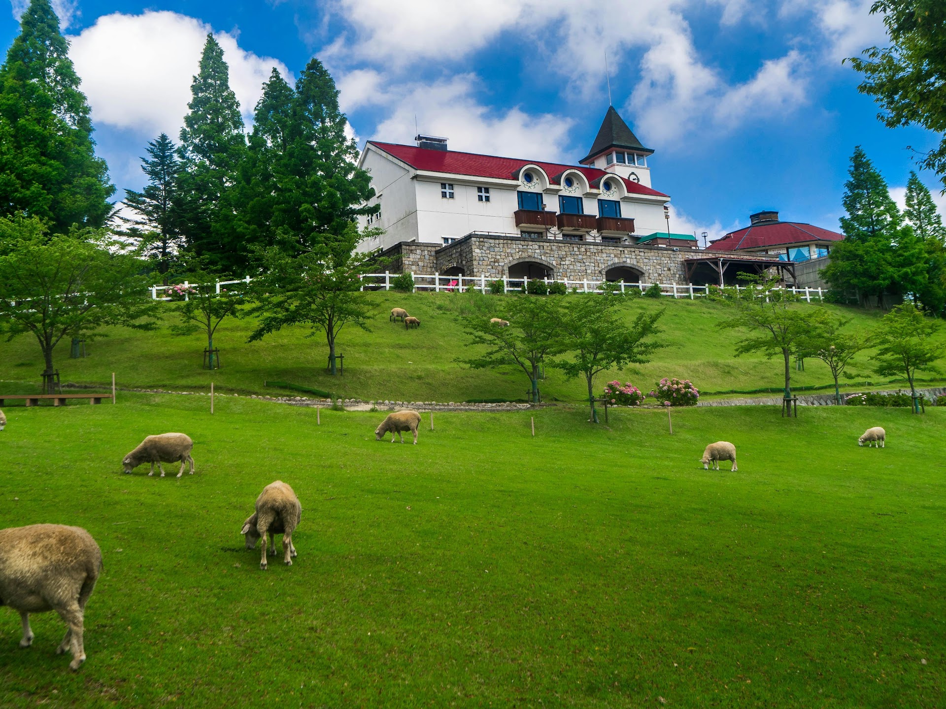 Scenic Landscape, Sheep Farm, Rolling Hills, European Architecture 5K Desktop and Mobile Wallpaper Background with a maximum resolution of 5940x3341 px.