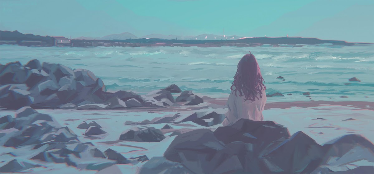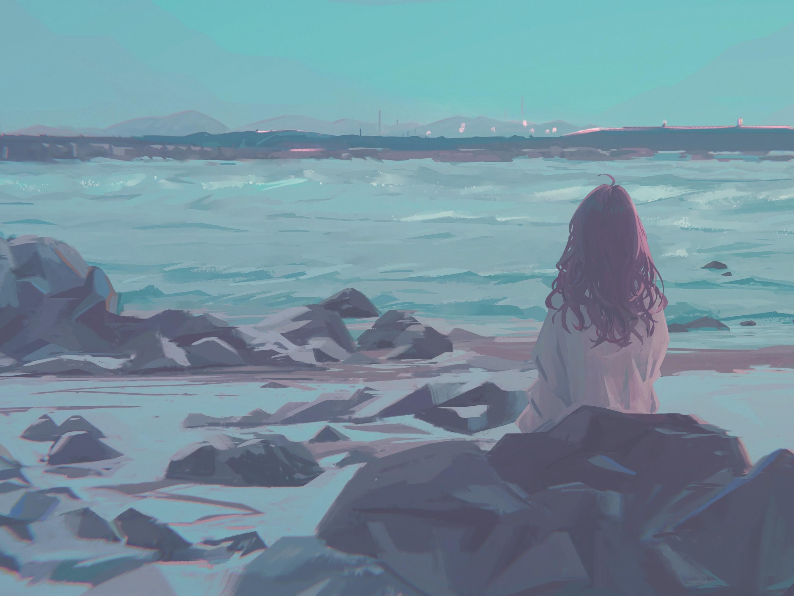 Seascape, Coastal Art, Digital Painting, Lonely Girl 4K Desktop and Mobile Wallpaper Background with a maximum resolution of 4860x2263 px.