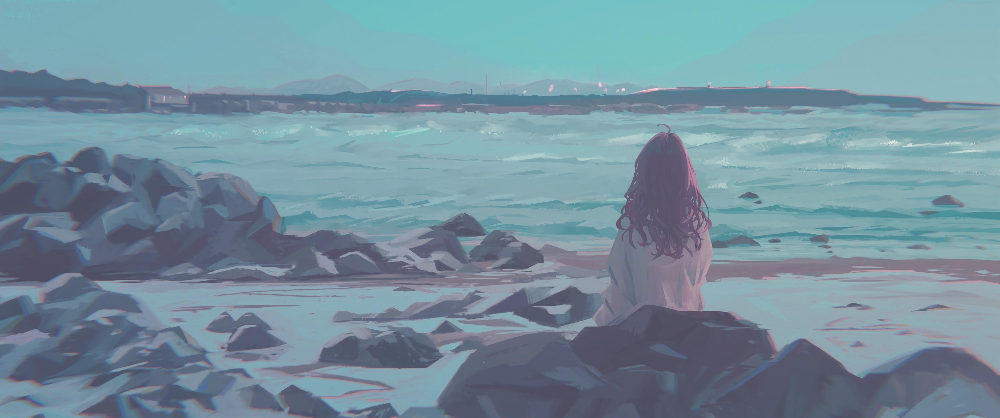 Seascape, Coastal Art, Digital Painting, Lonely Girl 4K Wallpaper Background (4860x2263)
