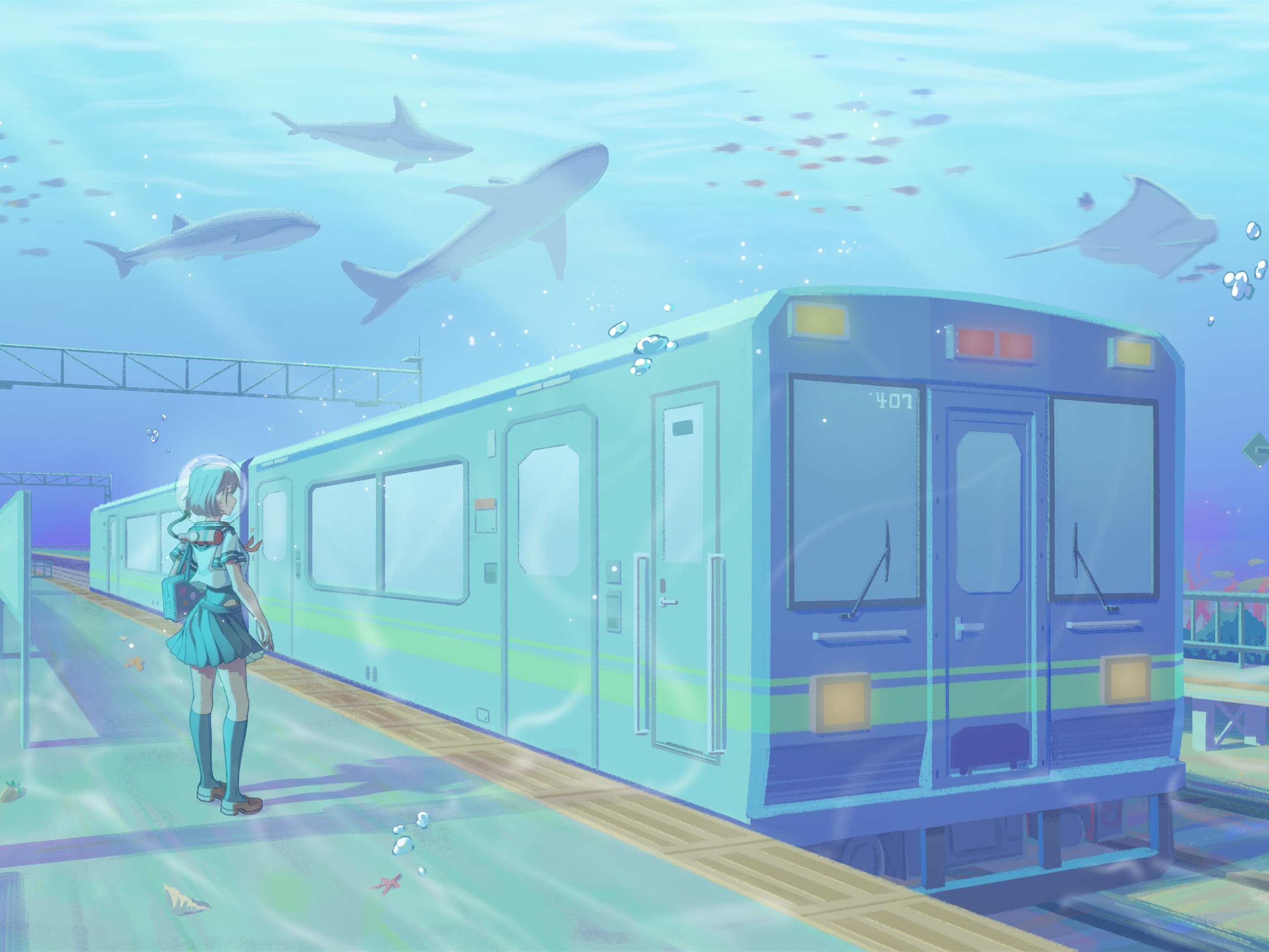 Underwater, Train, Anime, Station 4K Desktop and Mobile Wallpaper Background with a maximum resolution of 4136x2181 px.