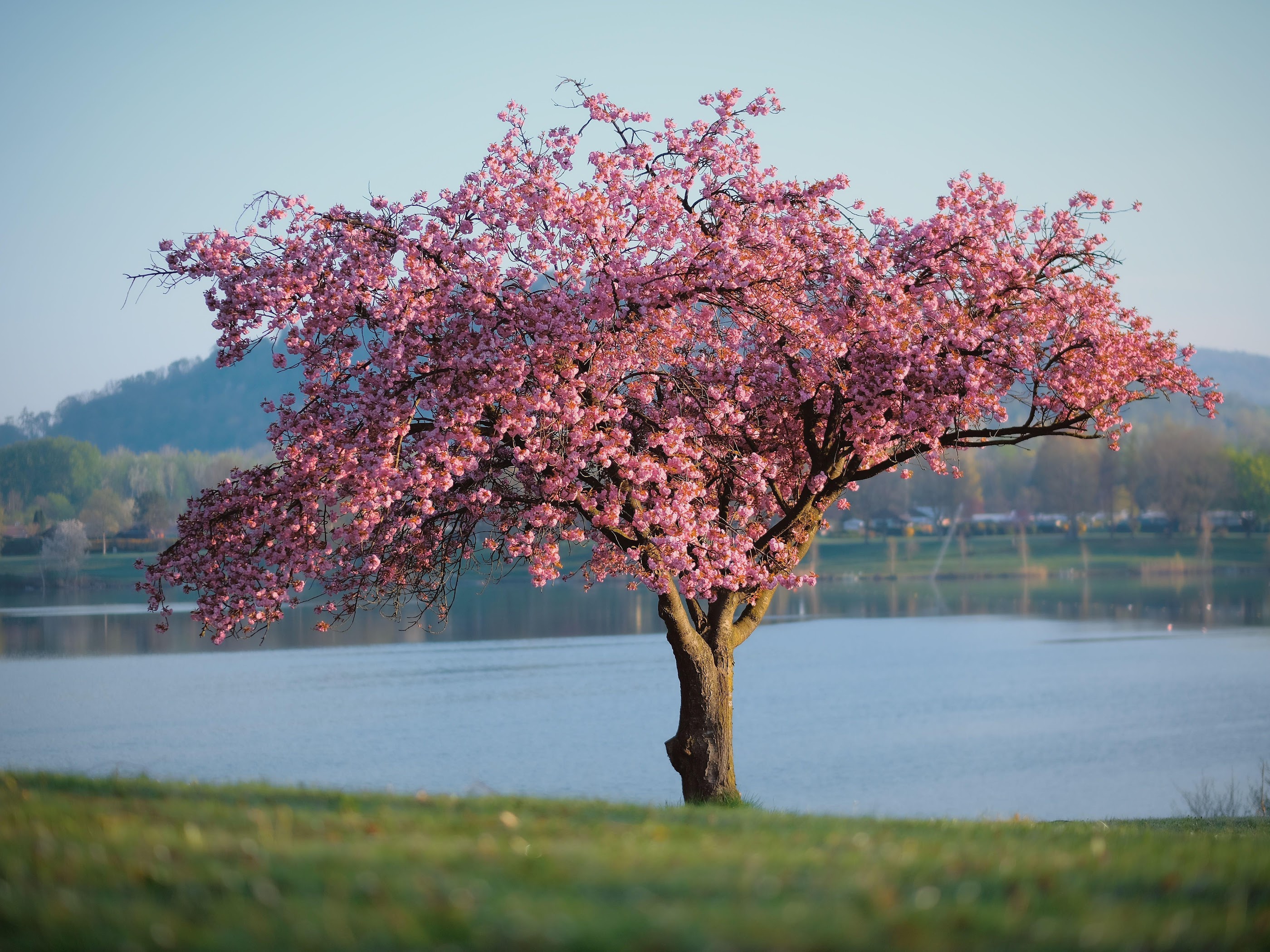 Cherry Blossom, Springtime, Lakeside, Nature Photography 5K Desktop and Mobile Wallpaper Background with a maximum resolution of 6240x4160 px.
