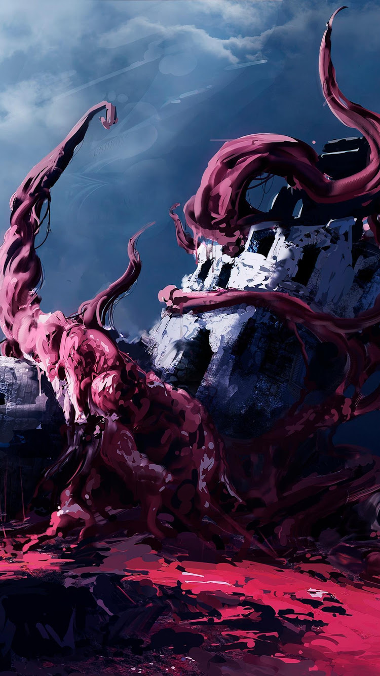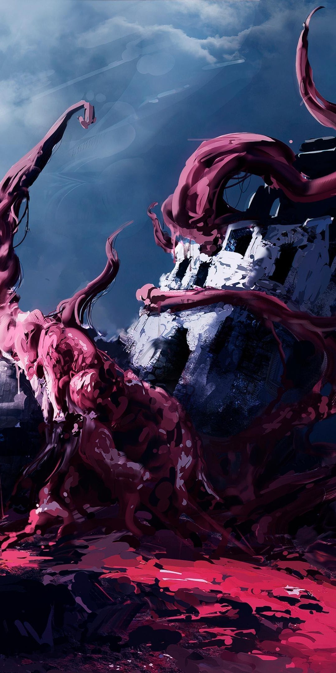 Horror Art, Digital Painting, Tentacles, Ruined Building 4K Ultrawide Desktop and Mobile Wallpaper Background with a maximum resolution of 5160x2160 px.