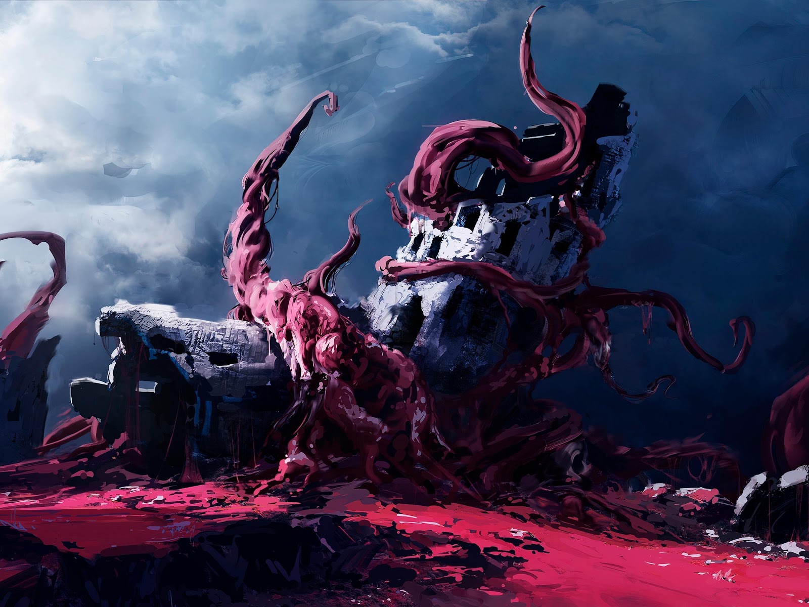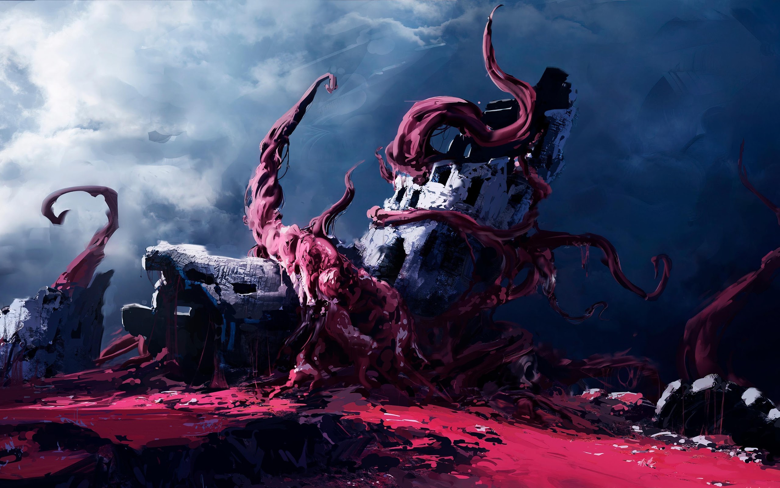 Horror Art, Digital Painting, Tentacles, Ruined Building 4K Ultrawide Desktop Wallpaper