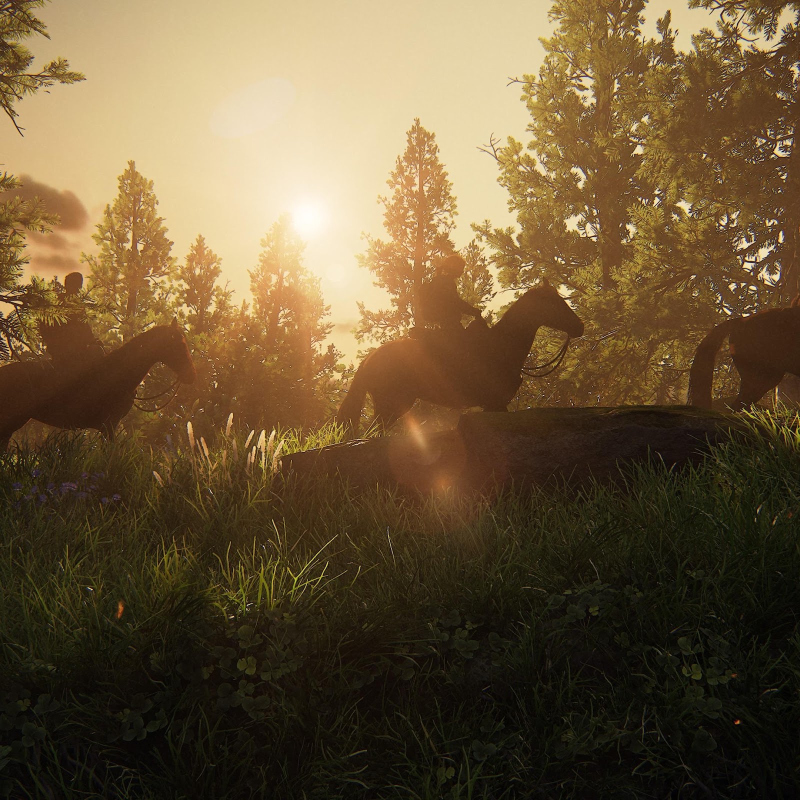 Horses, Sunset, Forest, Riders 4K Desktop and Mobile Wallpaper Background with a maximum resolution of 3840x2160 px.