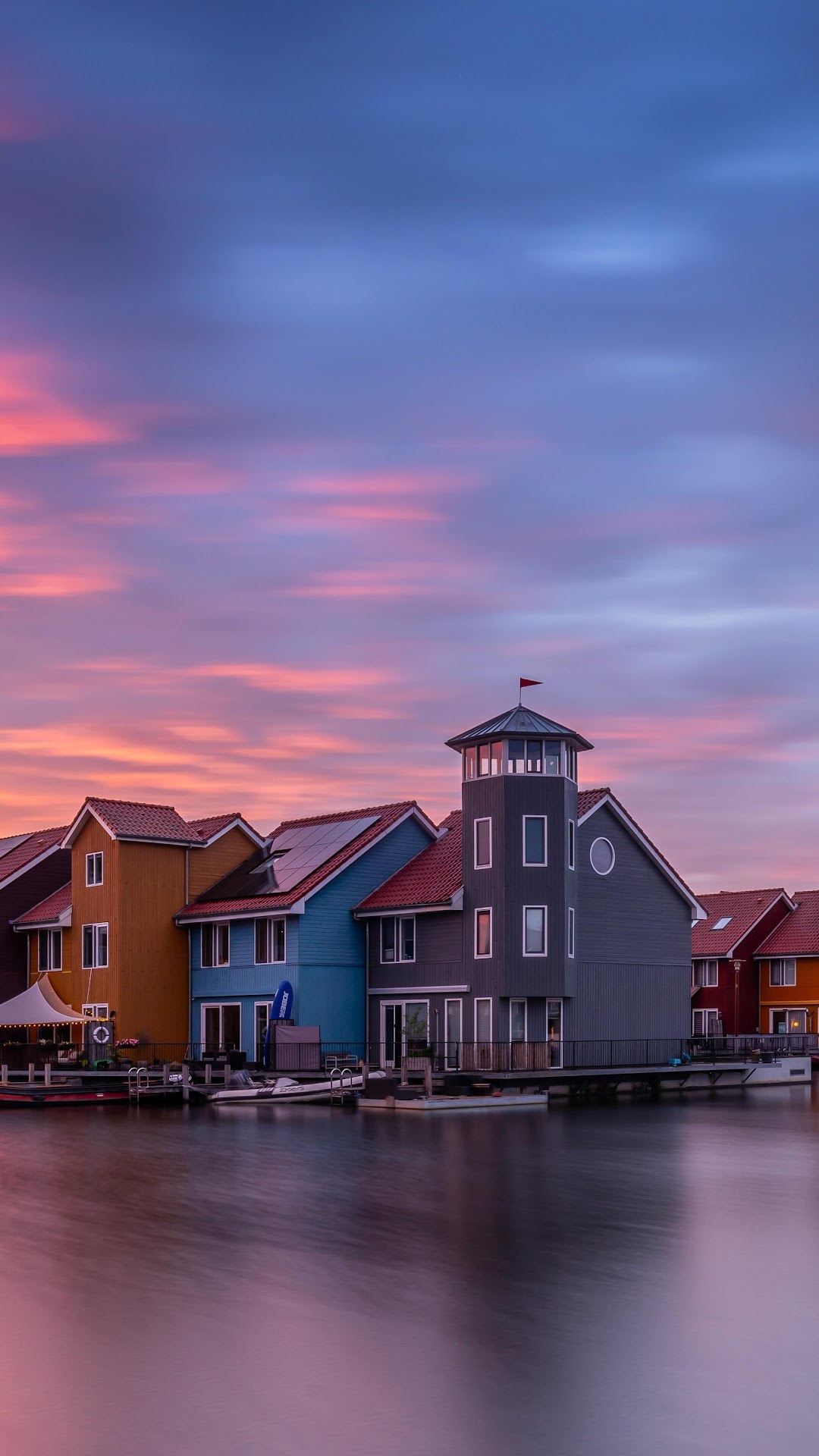 Houten, Netherlands, Colorful Houses, Sunset Photography 5K Desktop and Mobile Wallpaper Background with a maximum resolution of 6426x4173 px.
