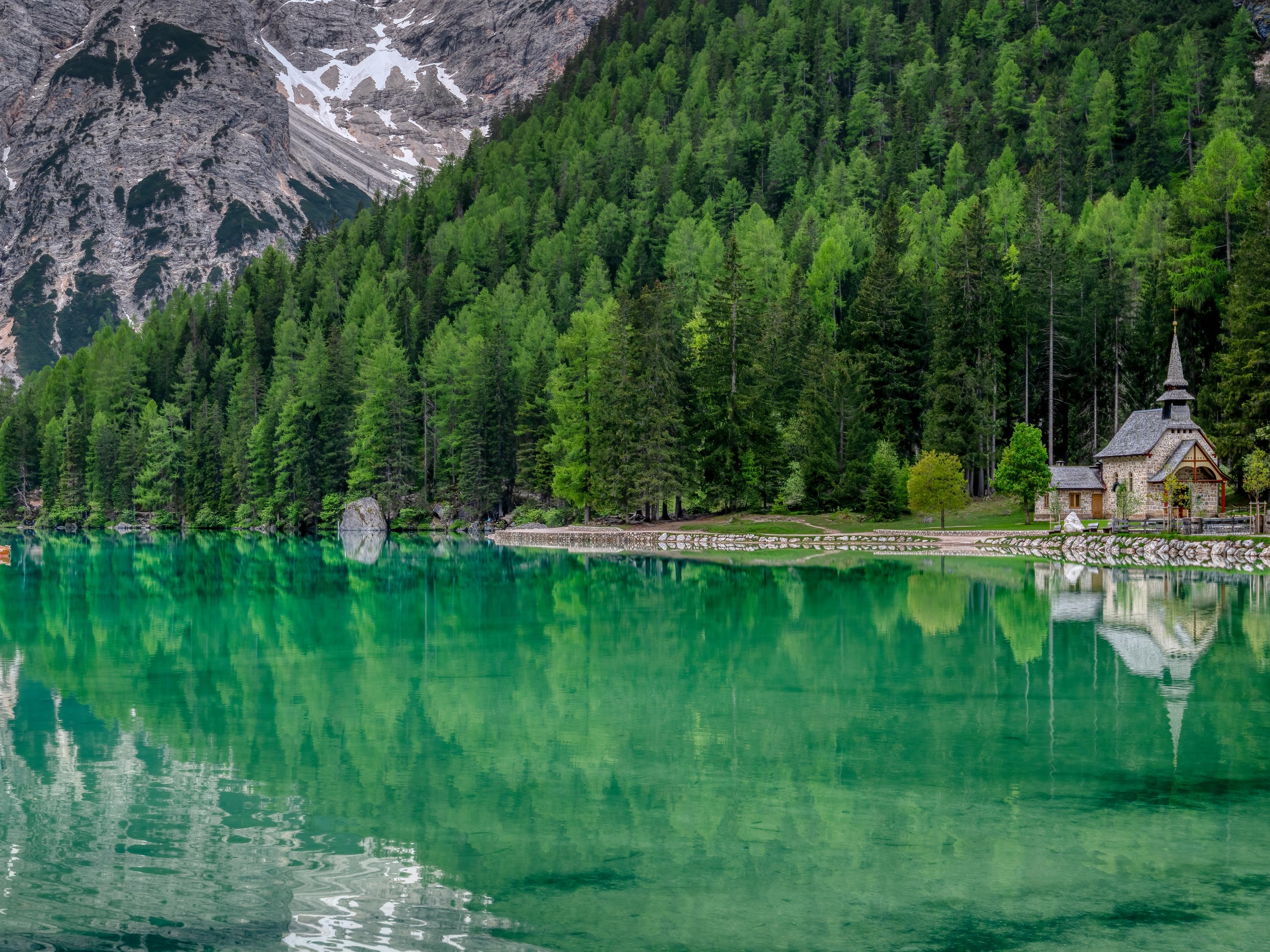 Lake Braies, Dolomites, Italy, Mountain Lake 5K Desktop and Mobile Wallpaper Background with a maximum resolution of 7364x3790 px.