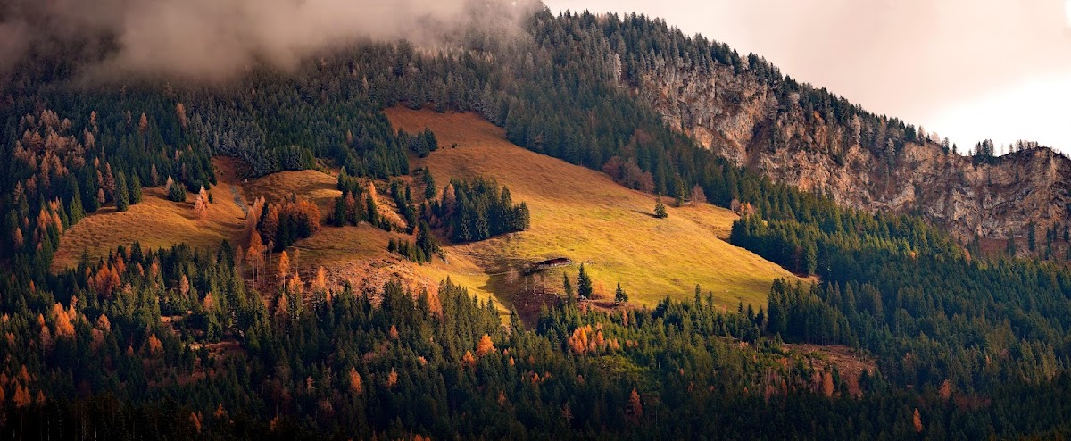 Mountain Landscape, Autumn Forest, Nature Scenery, Alpine Views 4K Desktop and Mobile Wallpaper Background with a maximum resolution of 6144x2527 px.