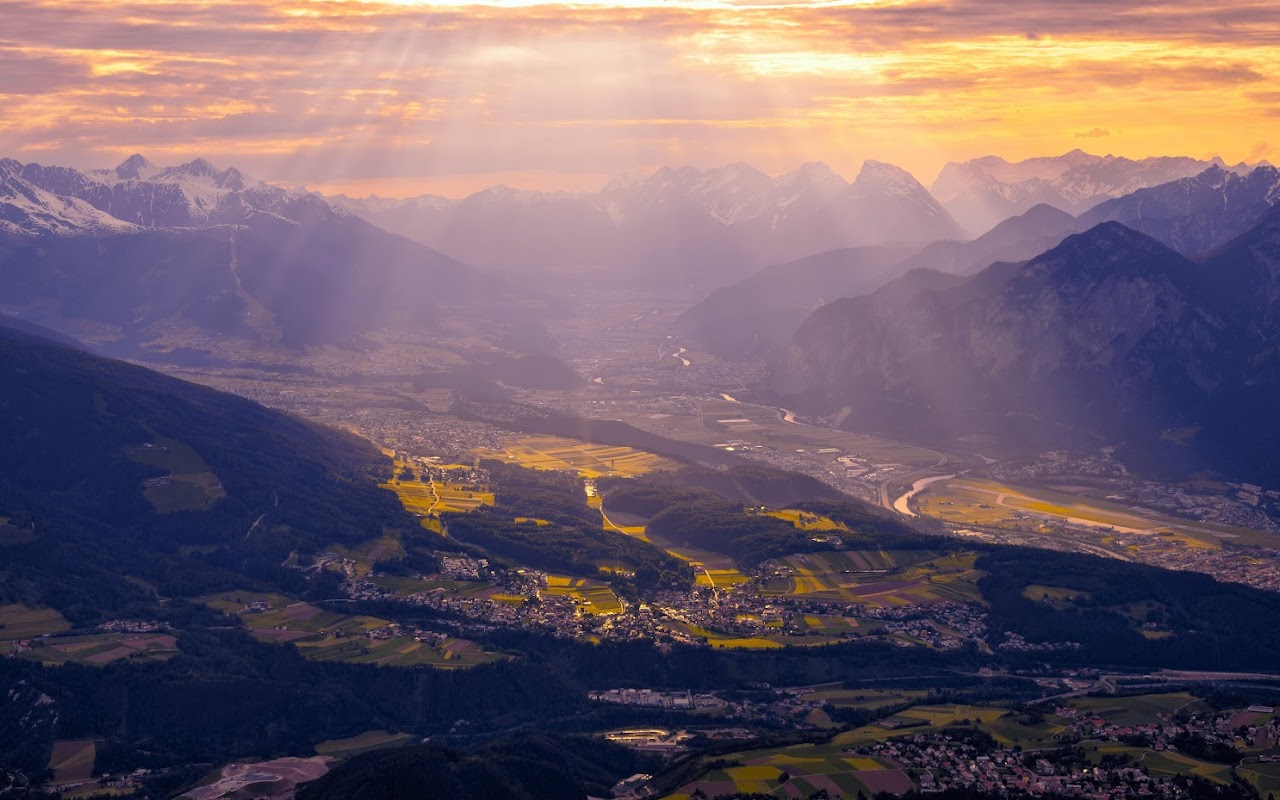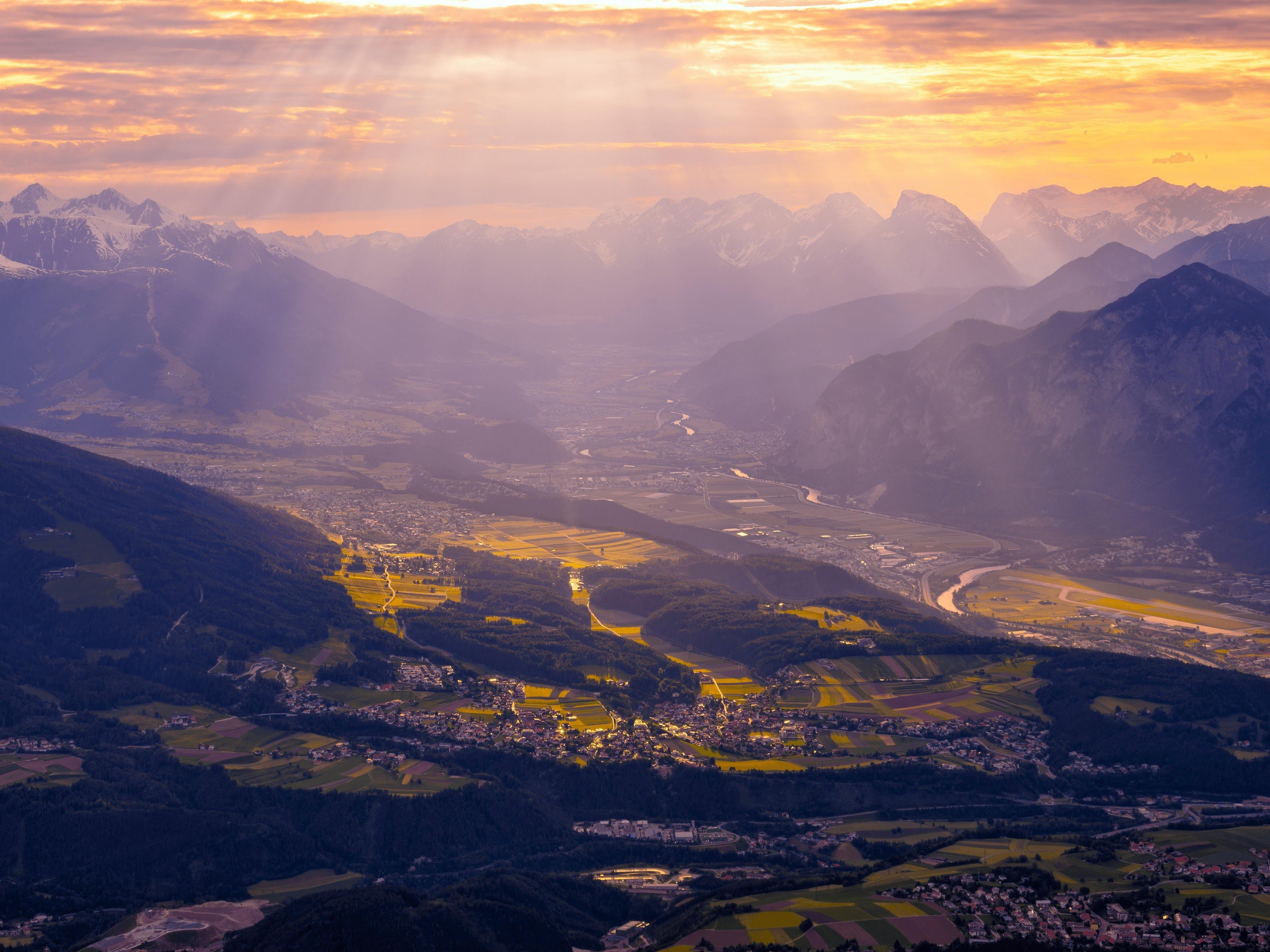 Mountain Landscape, Valley View, Alpine Scenery, Sunset Glow 5K Desktop Wallpaper