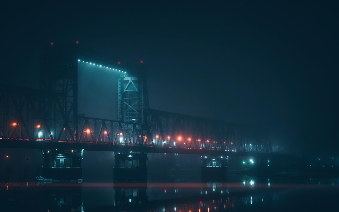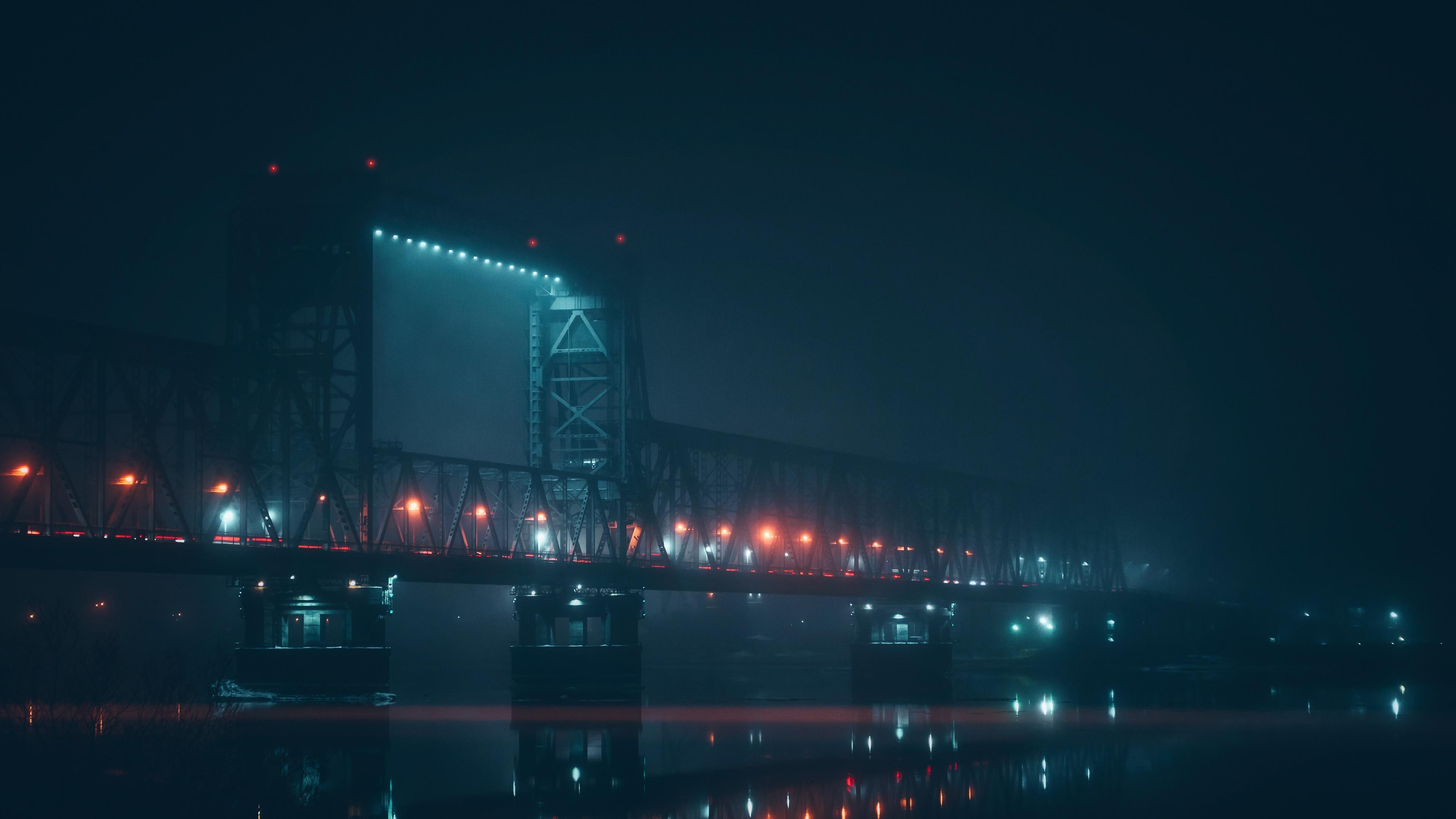 Night Bridge, River Reflection, Foggy Landscape, Urban Scene 4K Desktop Wallpaper