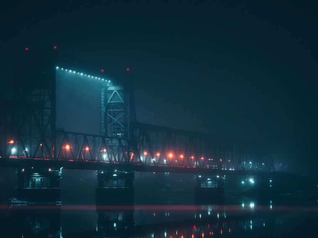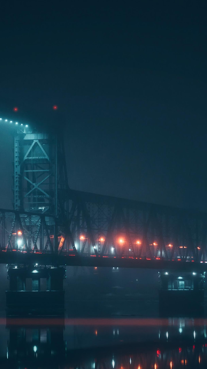 Night Bridge, River Reflection, Foggy Landscape, Urban Scene 4K Desktop and Mobile Wallpaper Background with a maximum resolution of 3840x2160 px.