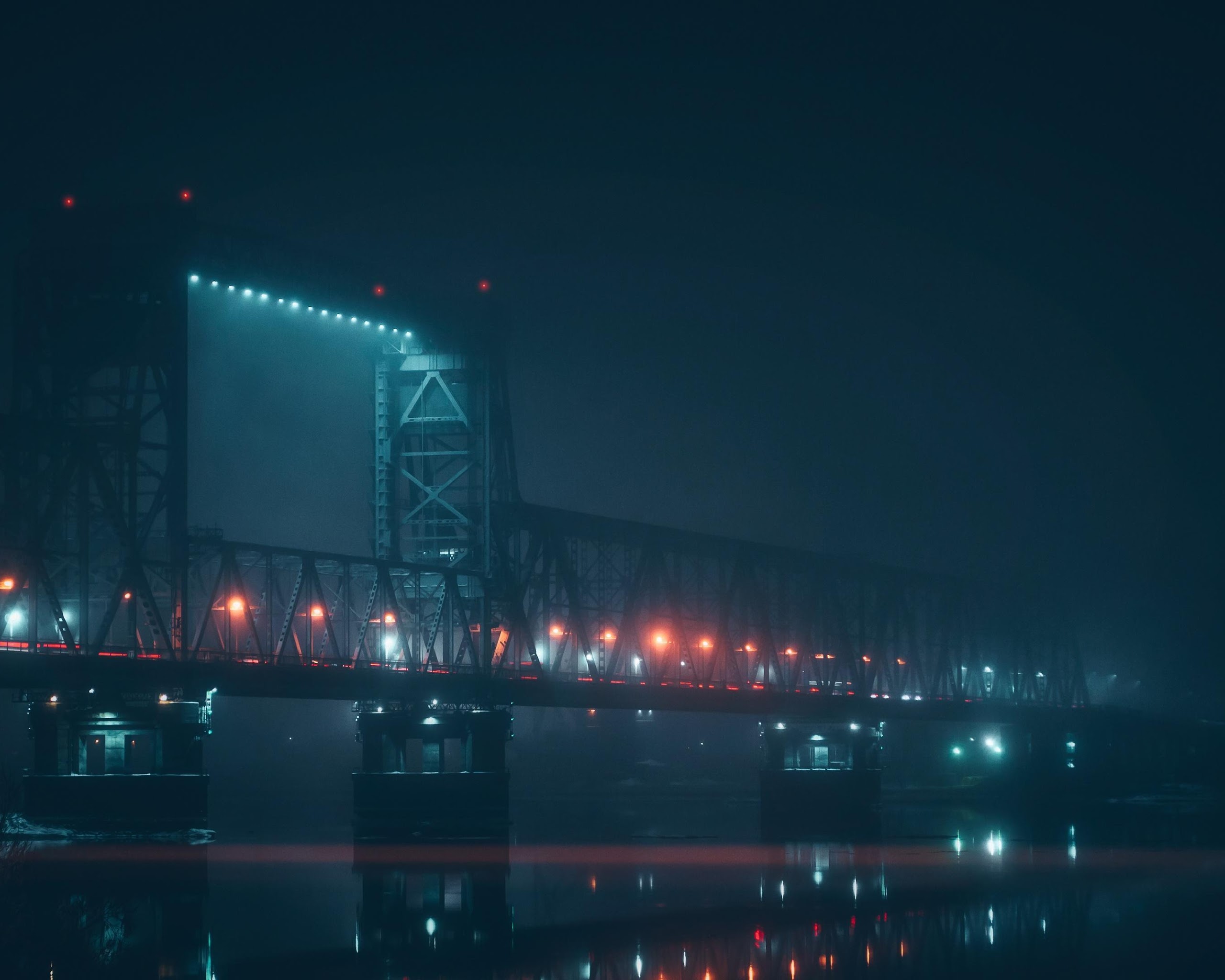 Night Bridge, River Reflection, Foggy Landscape, Urban Scene 4K Desktop Wallpaper