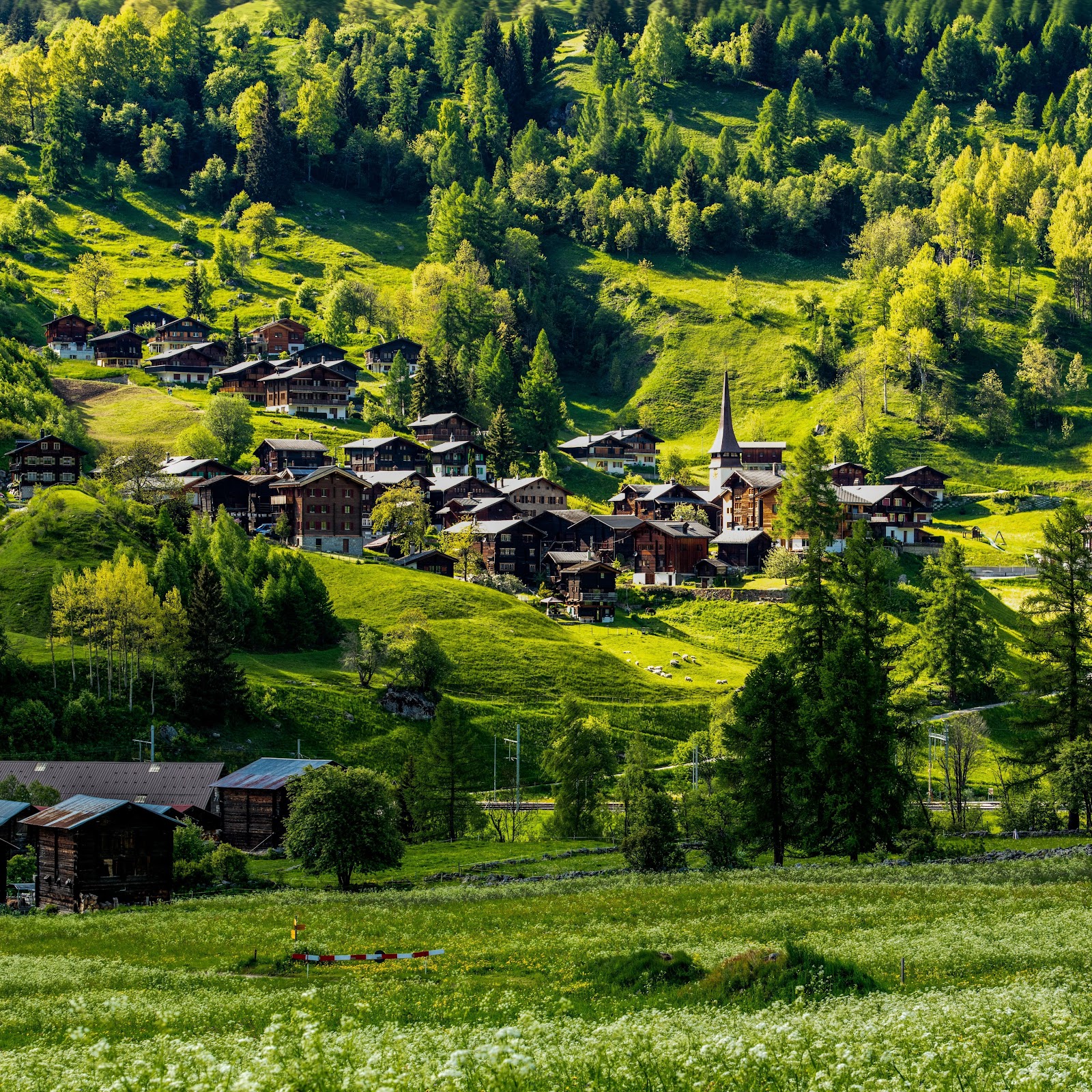 Swiss Alps, Mountain Village, Alpine Scenery, Green Landscape 8K Desktop Wallpaper