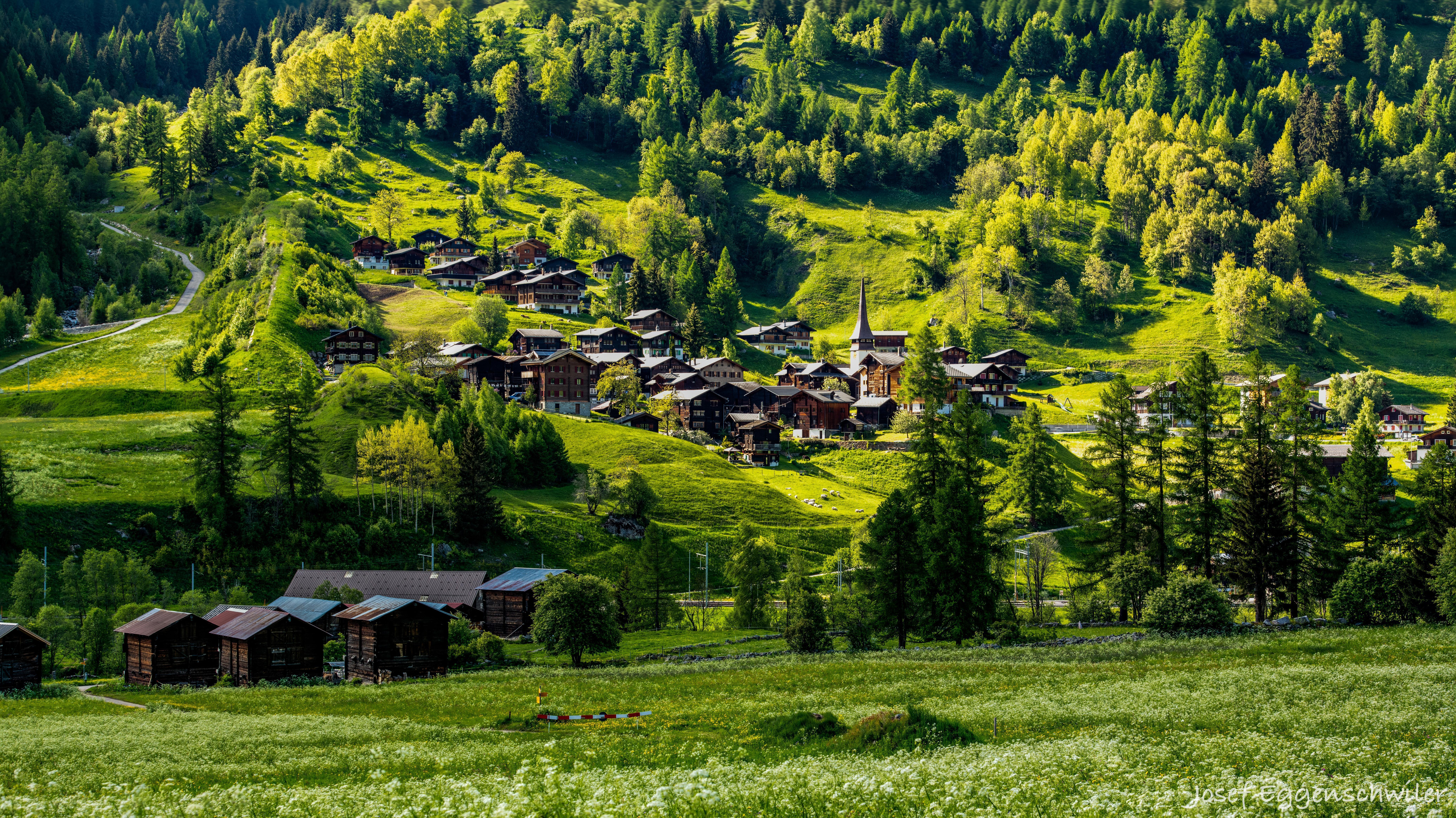 Swiss Alps, Mountain Village, Alpine Scenery, Green Landscape 8K Wallpaper Background (8296x4666)