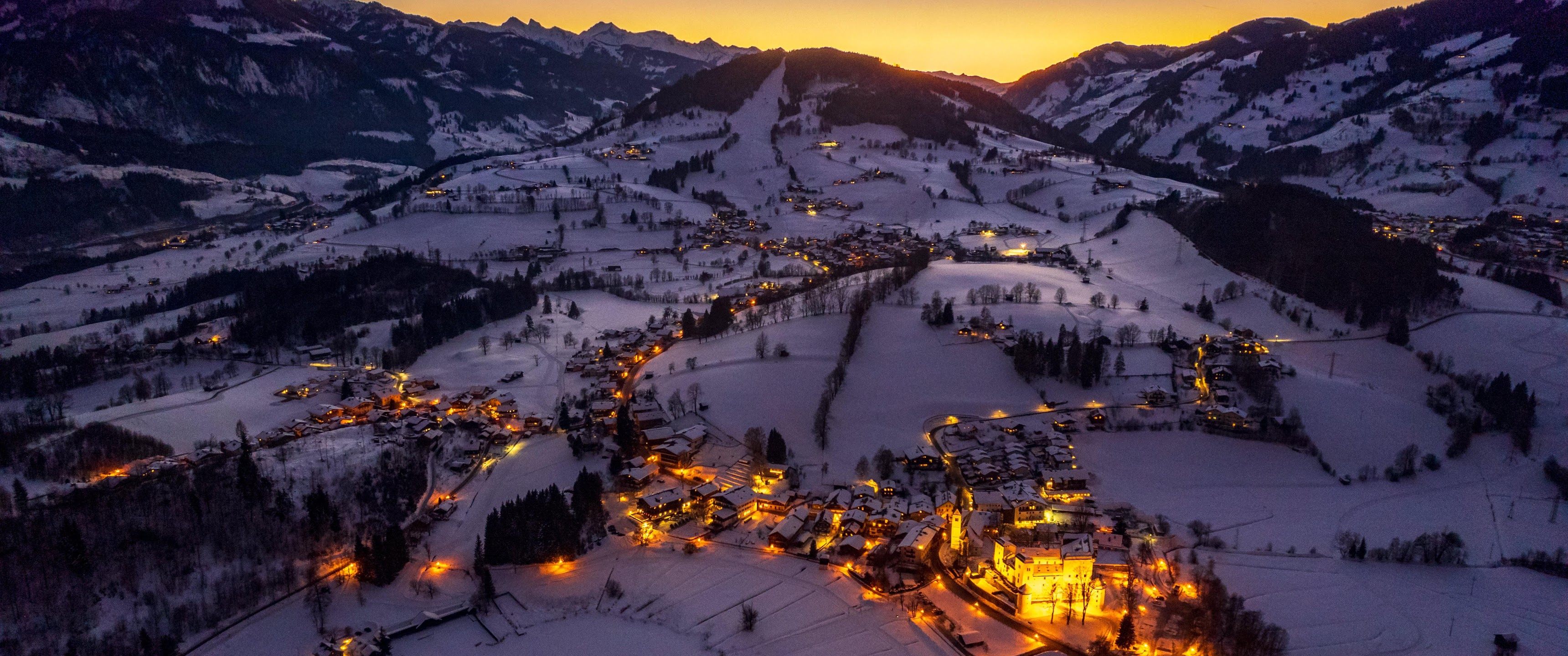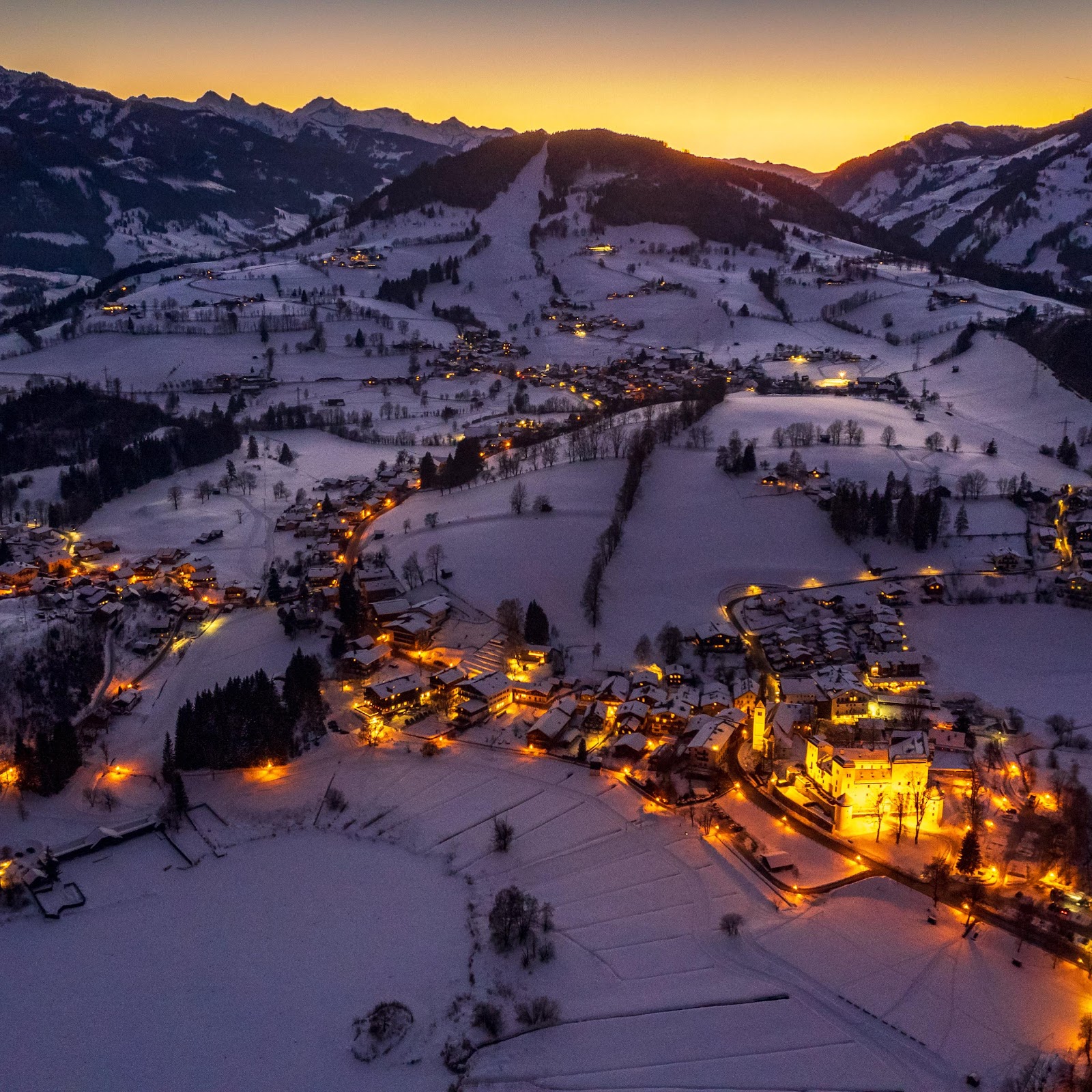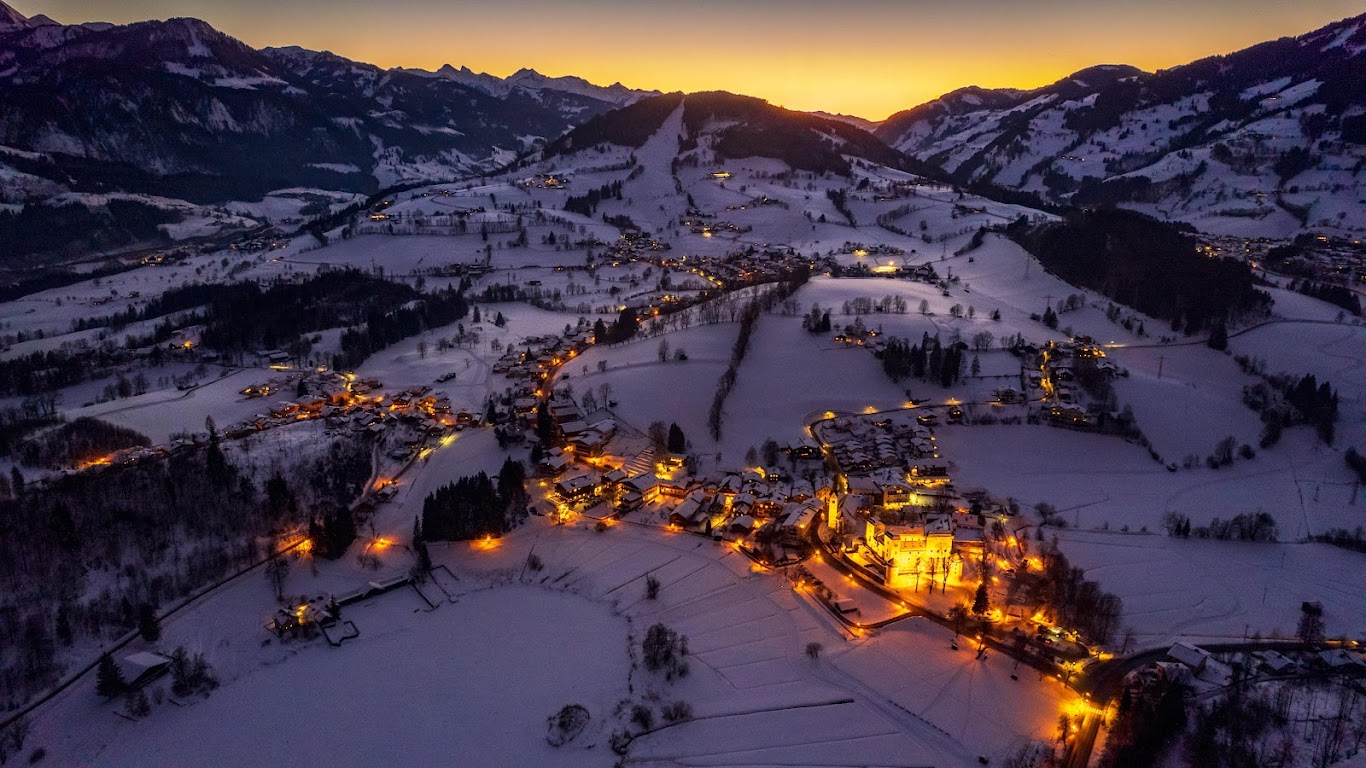 Winter Landscape, Aerial View, Mountain Village, Snow Covered 5K Desktop and Mobile Wallpaper Background with a maximum resolution of 5120x2880 px.