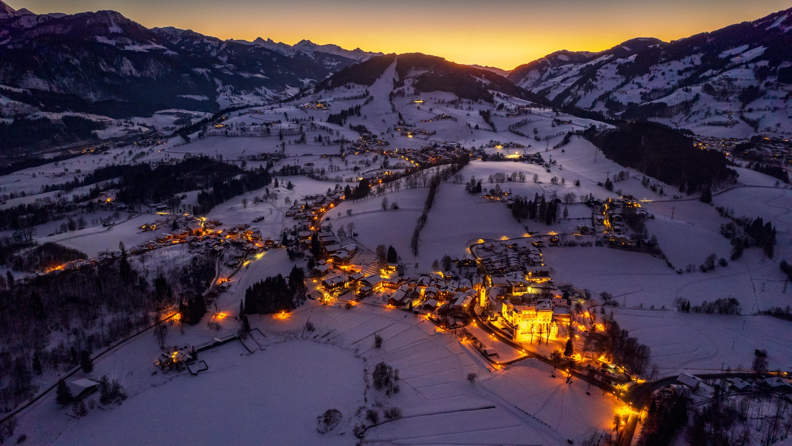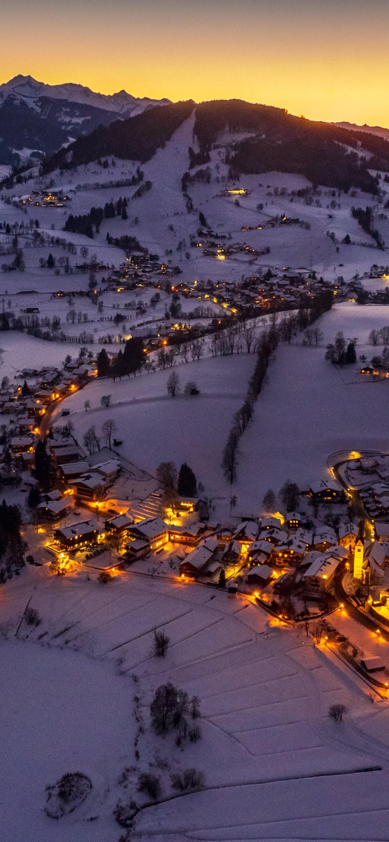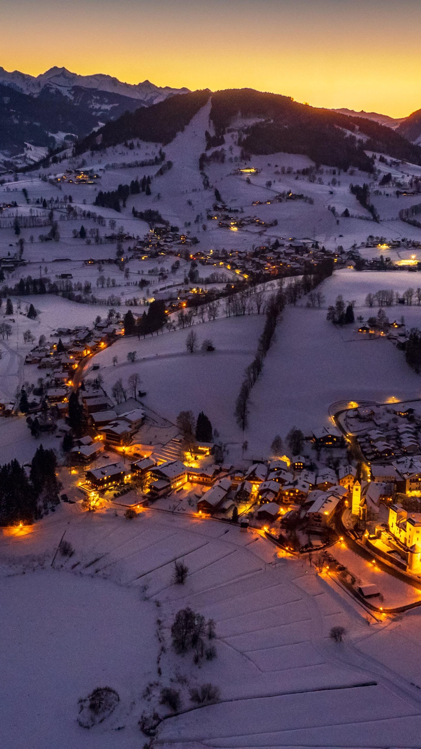 Winter Landscape, Aerial View, Mountain Village, Snow Covered 5K Desktop Wallpaper