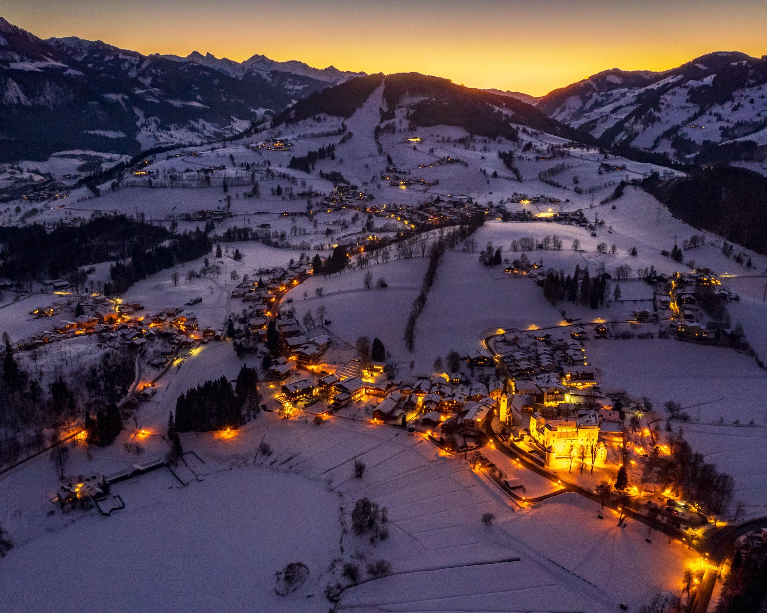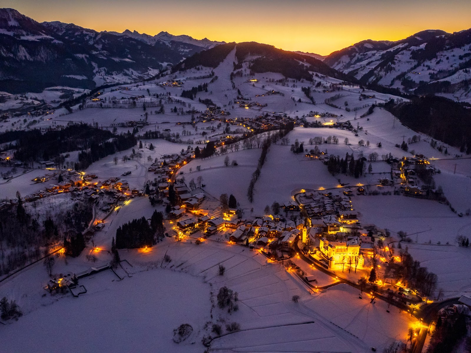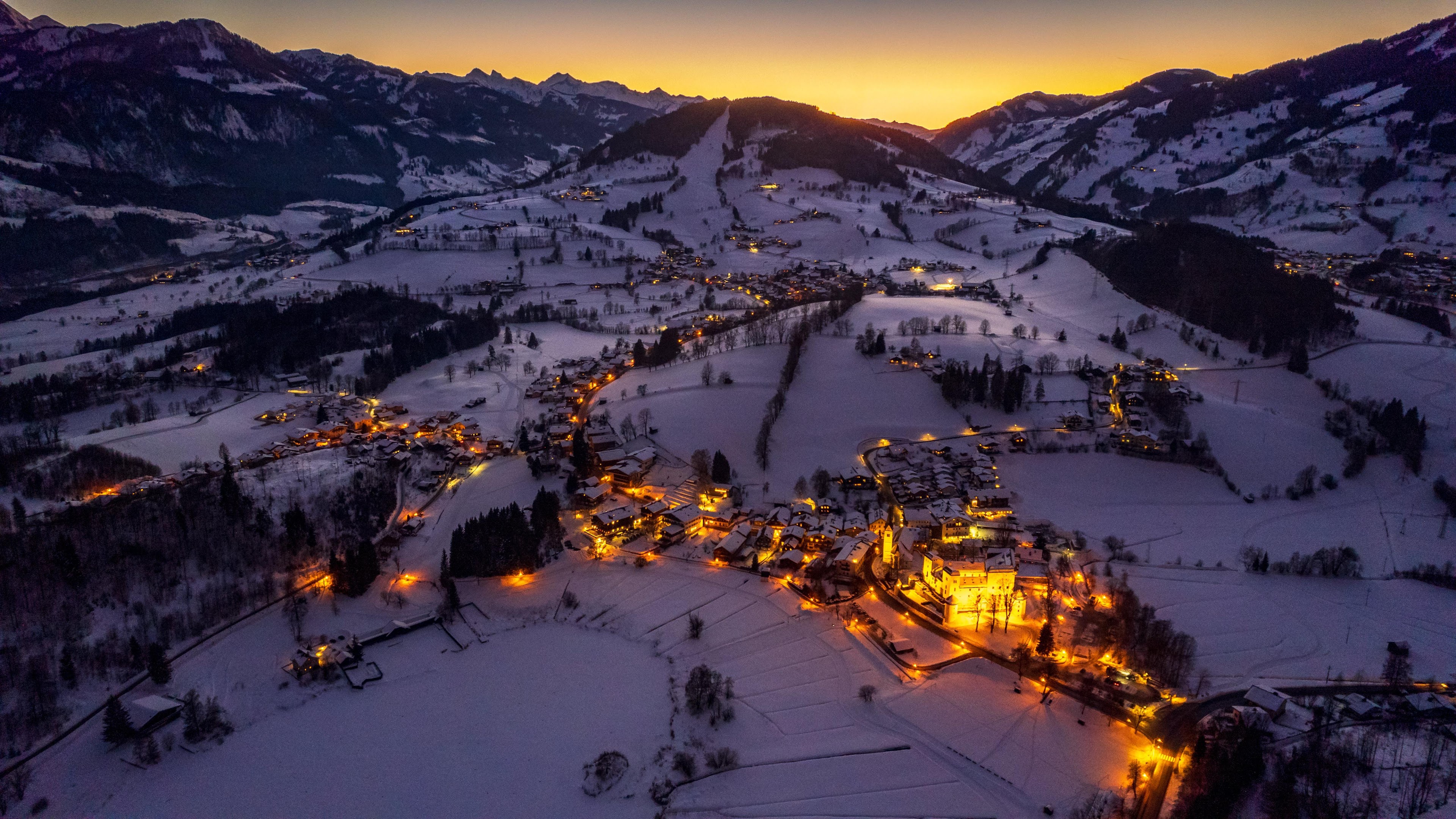Winter Landscape, Aerial View, Mountain Village, Snow Covered 5K Desktop Wallpaper