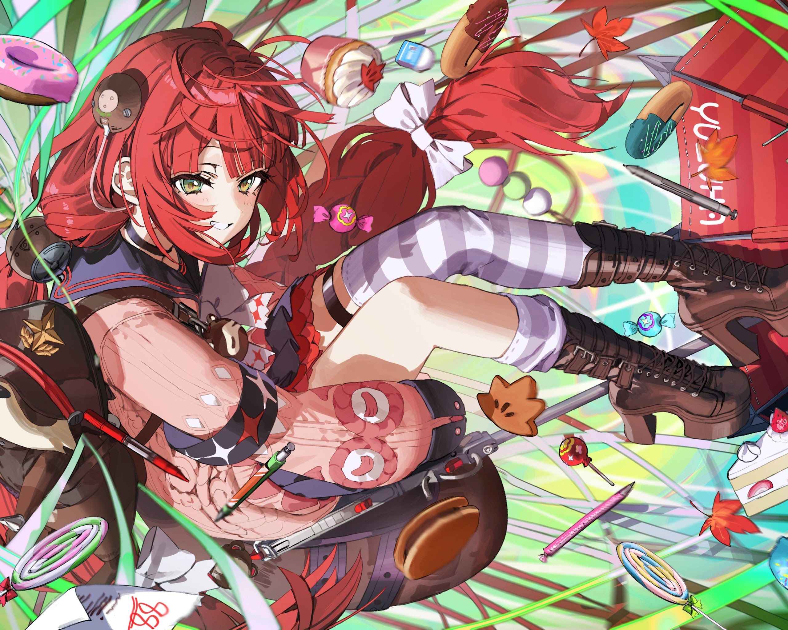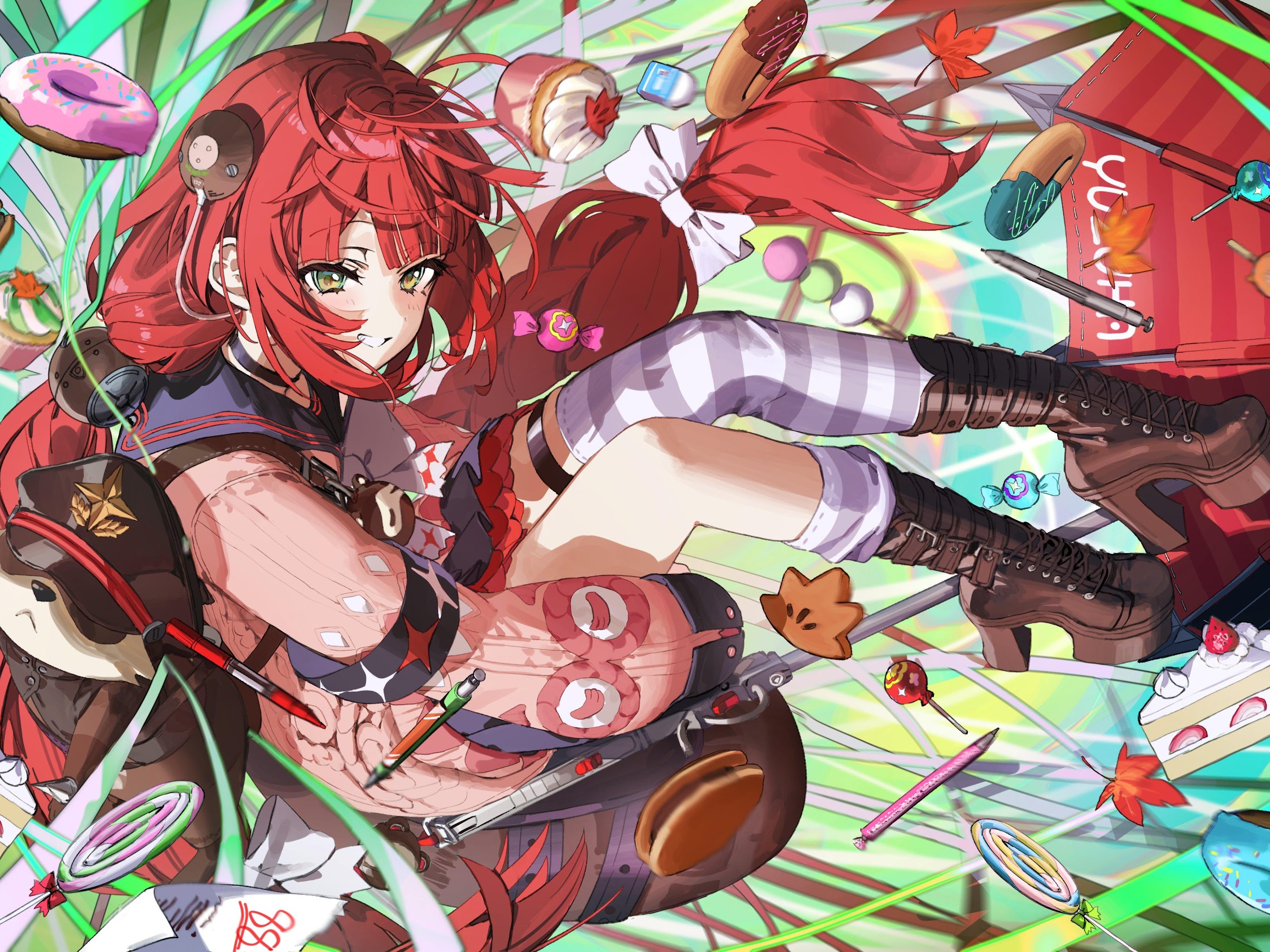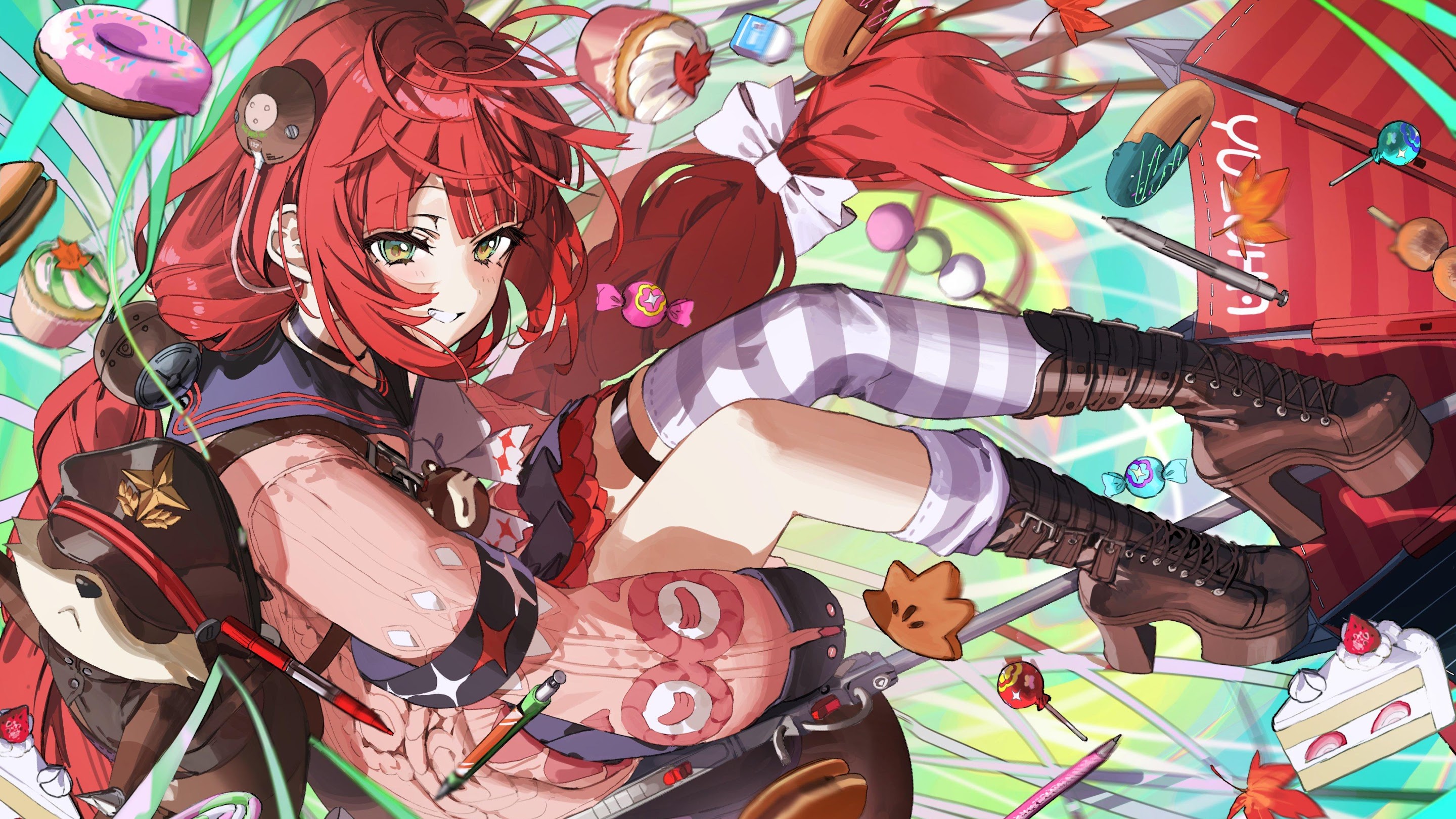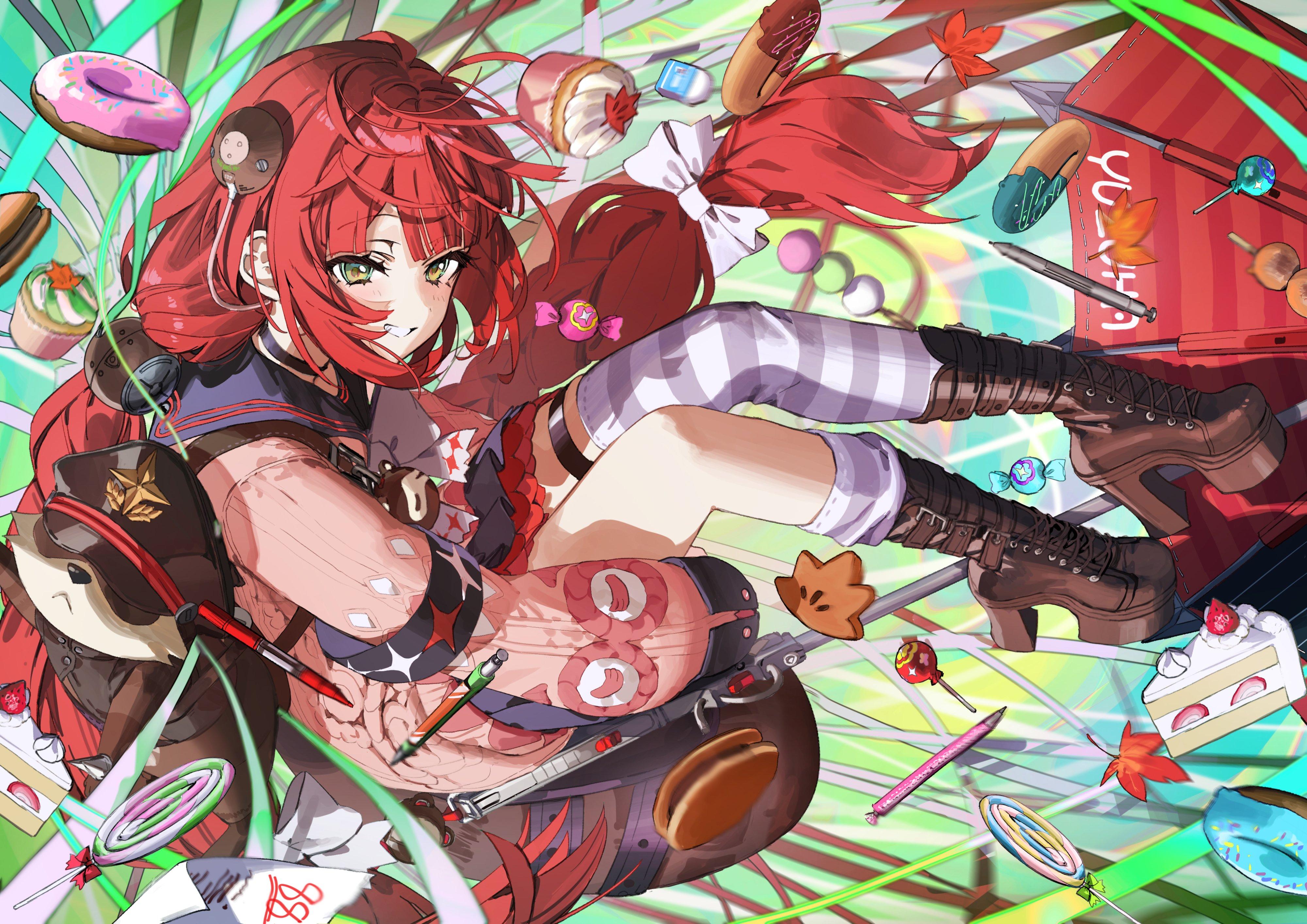 Anime Girl, Red Hair, Desserts, Digital Art 4K Desktop and Mobile Wallpaper Background with a maximum resolution of 4000x2828 px.