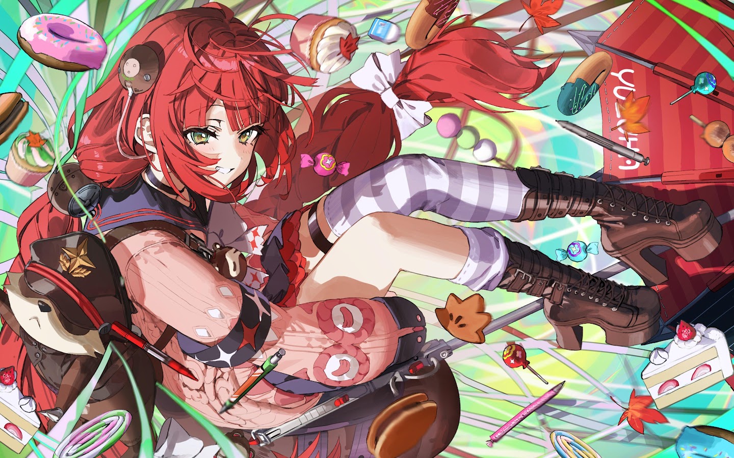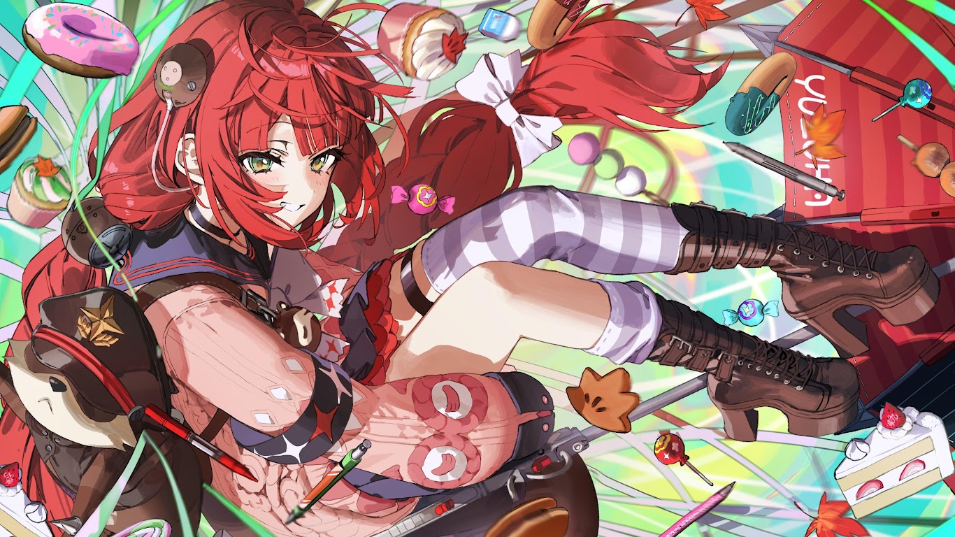 Anime Girl, Red Hair, Desserts, Digital Art 4K Desktop Wallpaper
