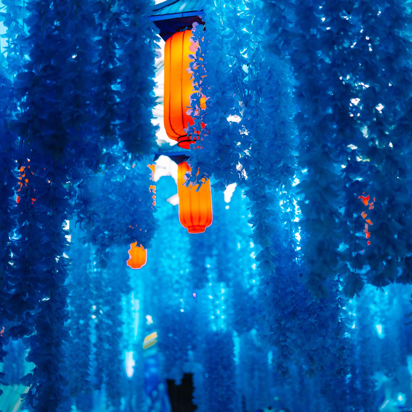 Blue Flowers, Chinese Lanterns, Asian Decor, Floral Arrangement 8K Desktop and Mobile Wallpaper Background with a maximum resolution of 9179x6216 px.