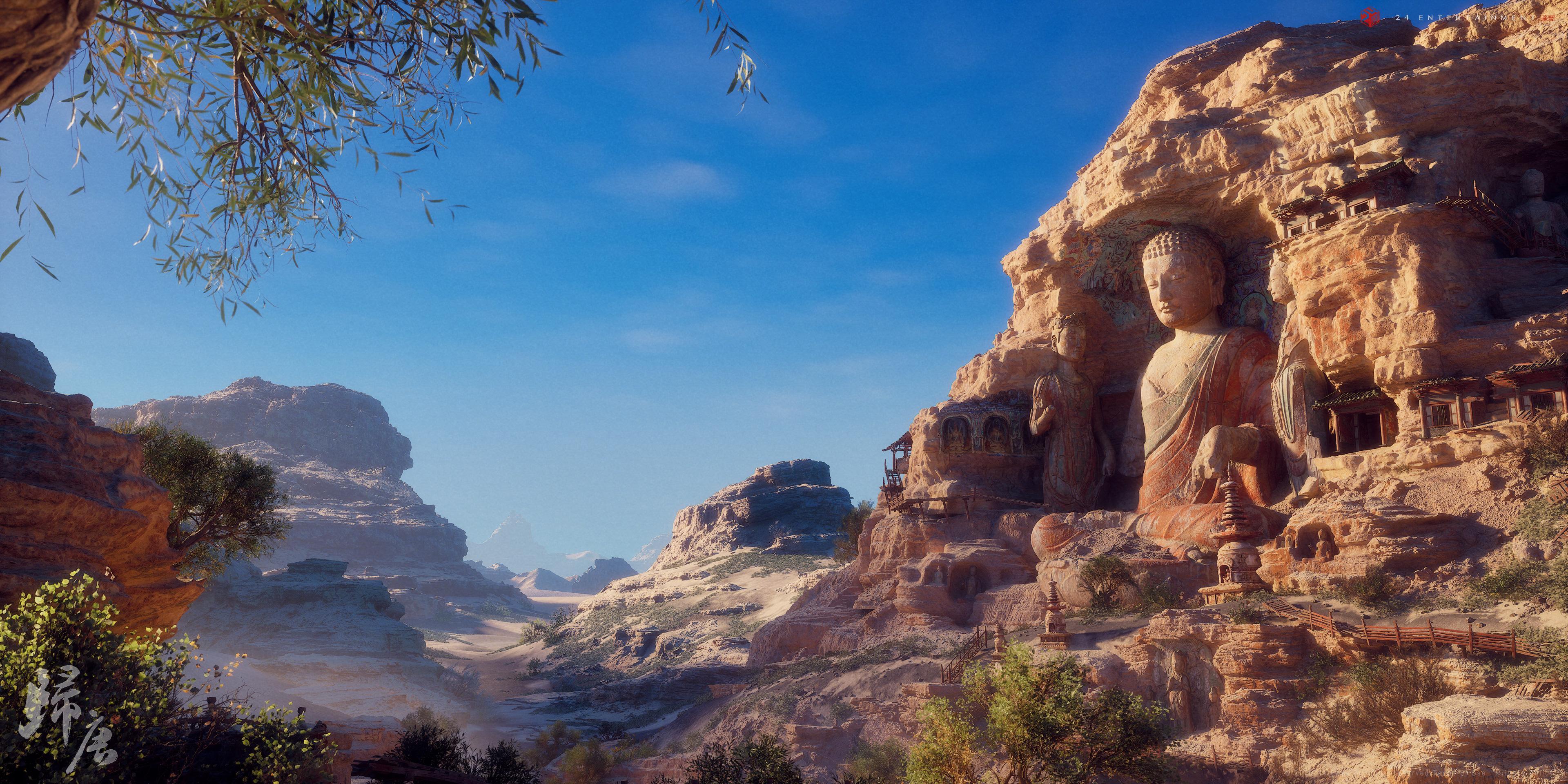 Buddha Statue, Asian Architecture, Religious Art, Canyon Landscape 2K Desktop Wallpaper