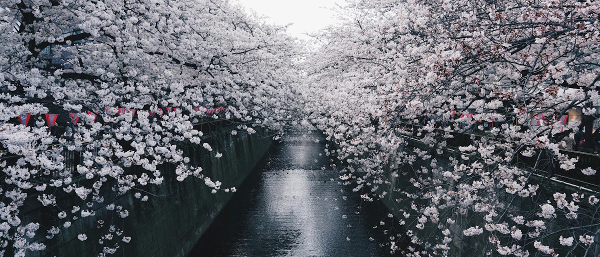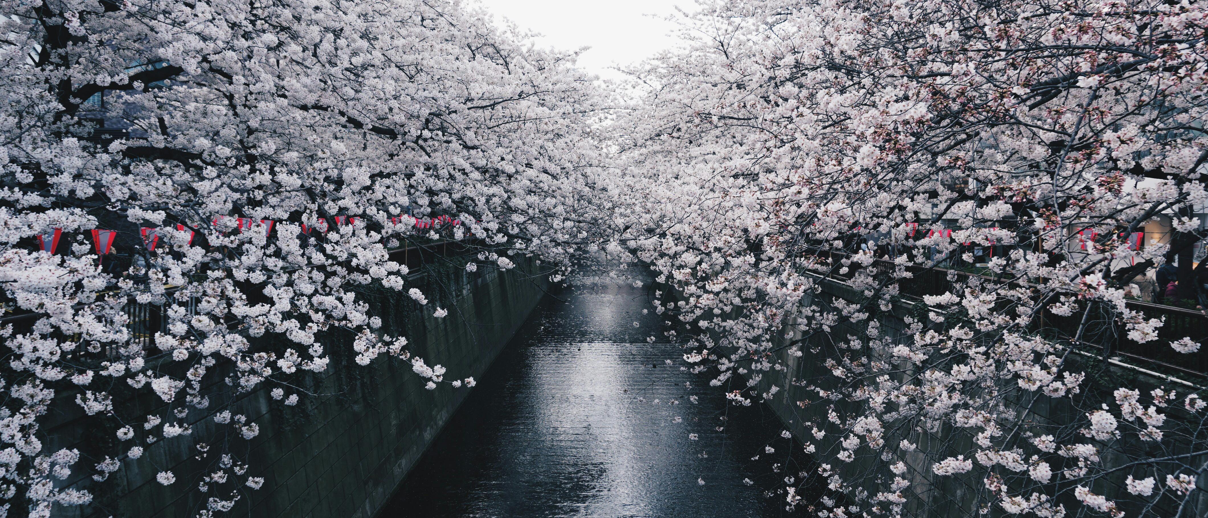 Cherry Blossoms, Japan, River, Springtime 2K Ultrawide Desktop and Mobile Wallpaper Background with a maximum resolution of 4240x1817 px.