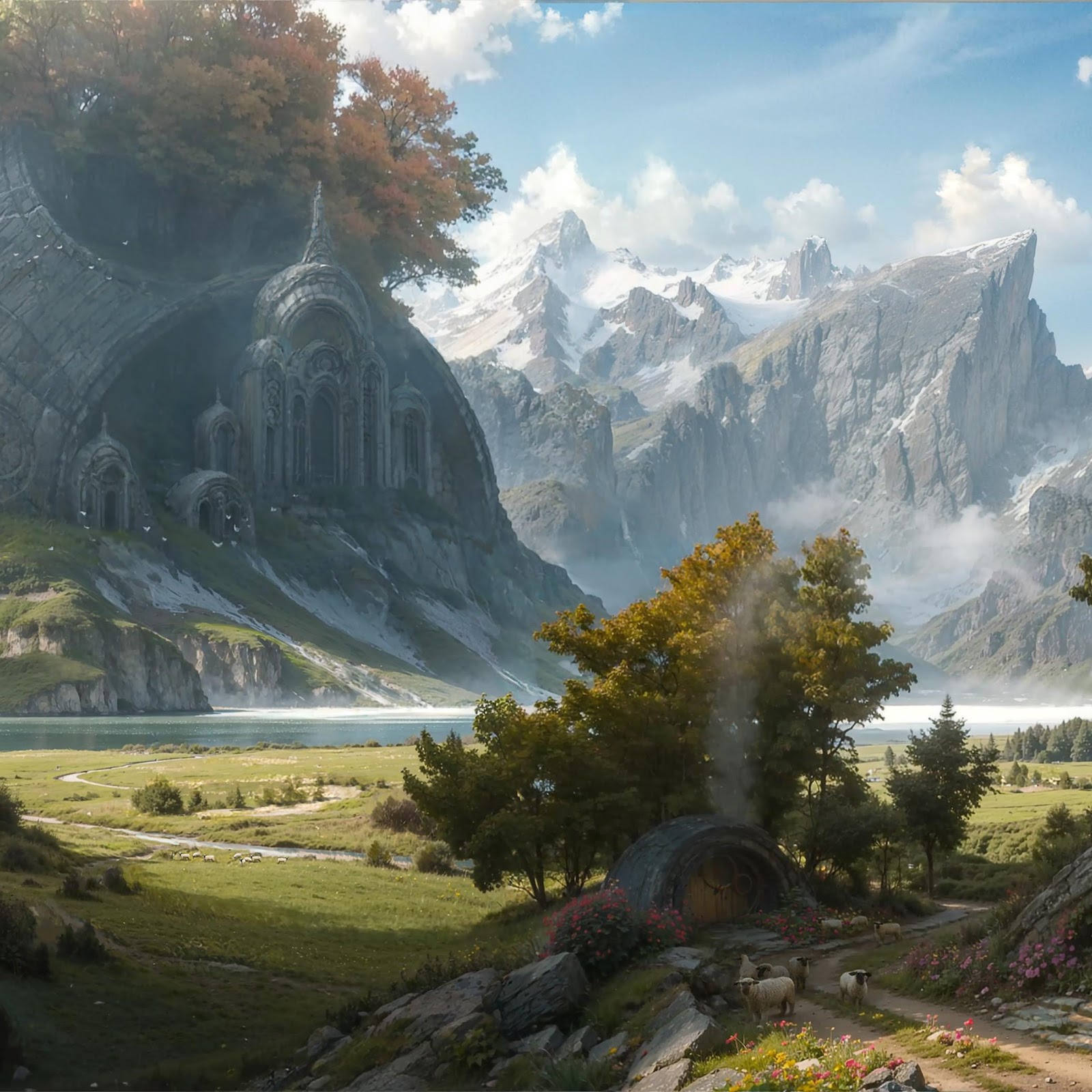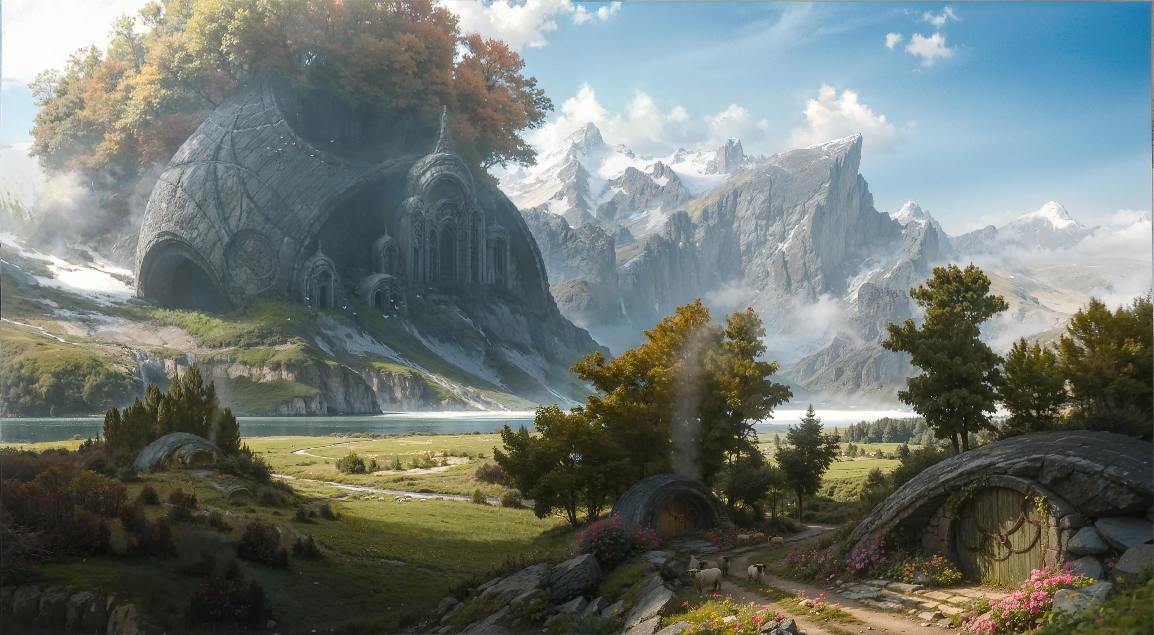 Fantasy Landscape, Mountains, Tolkien-Inspired, Hobbiton 2K Desktop and Mobile Wallpaper Background with a maximum resolution of 3840x2115 px.