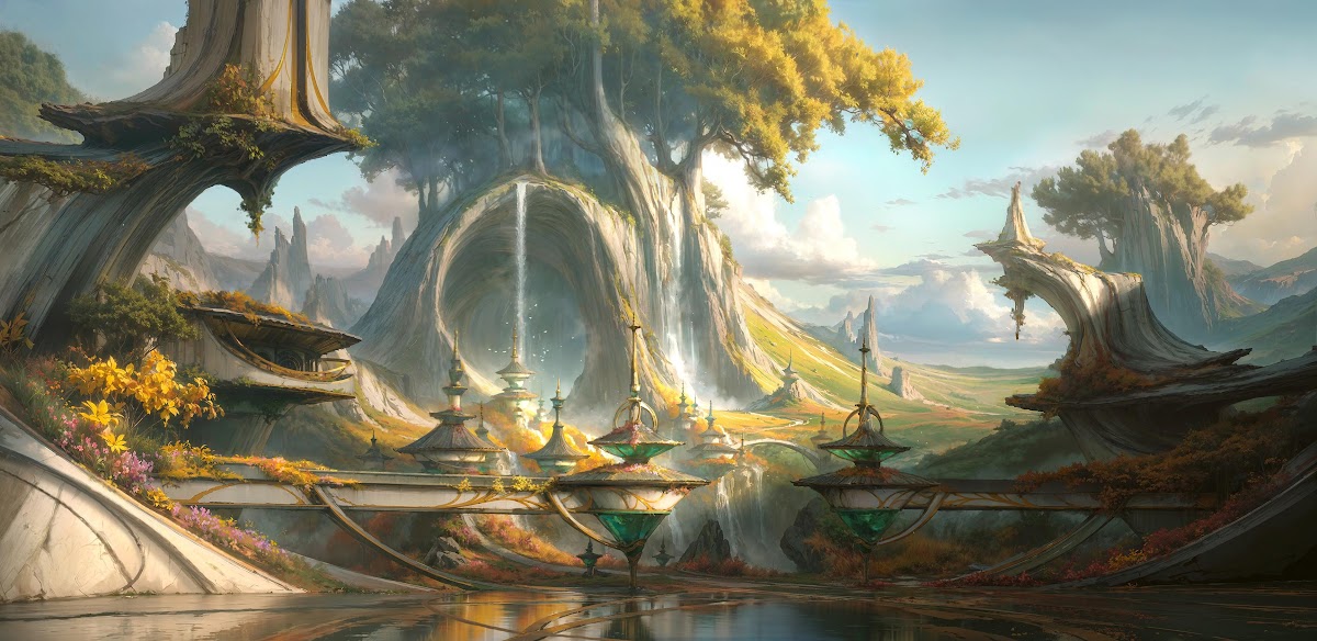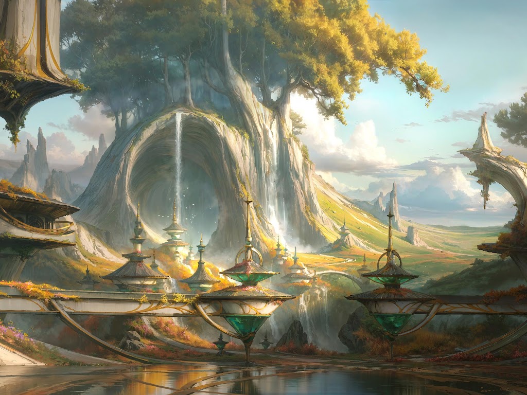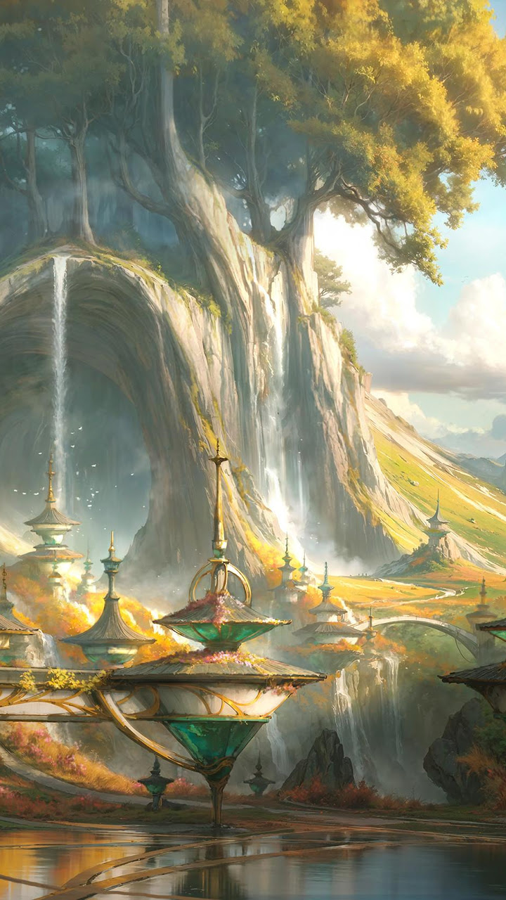 Fantasy Landscape, Waterfall, Utopia, Architecture 2K Desktop and Mobile Wallpaper Background with a maximum resolution of 3451x1679 px.