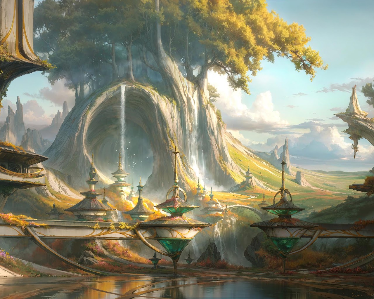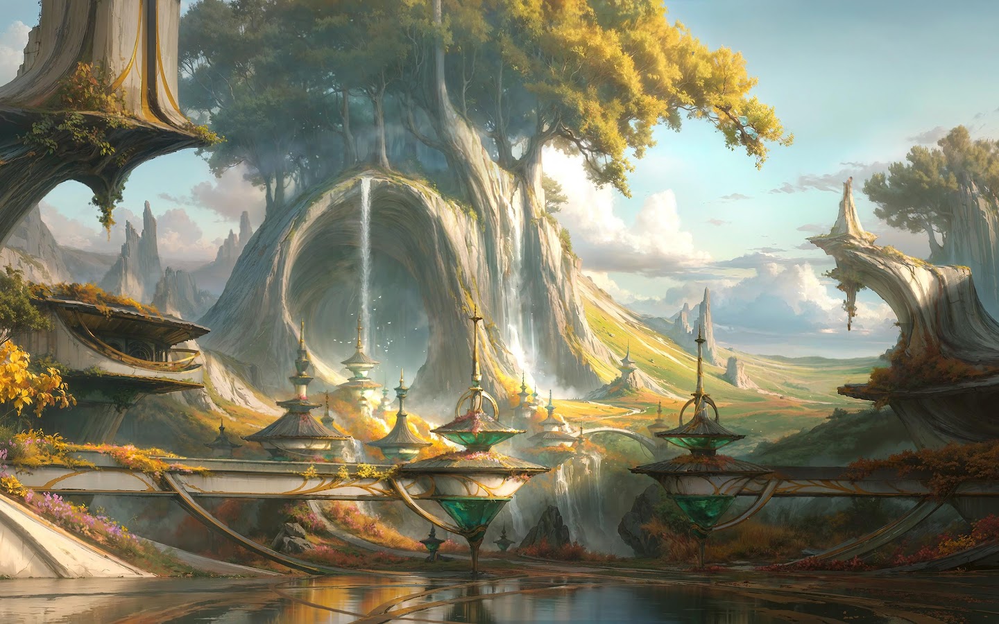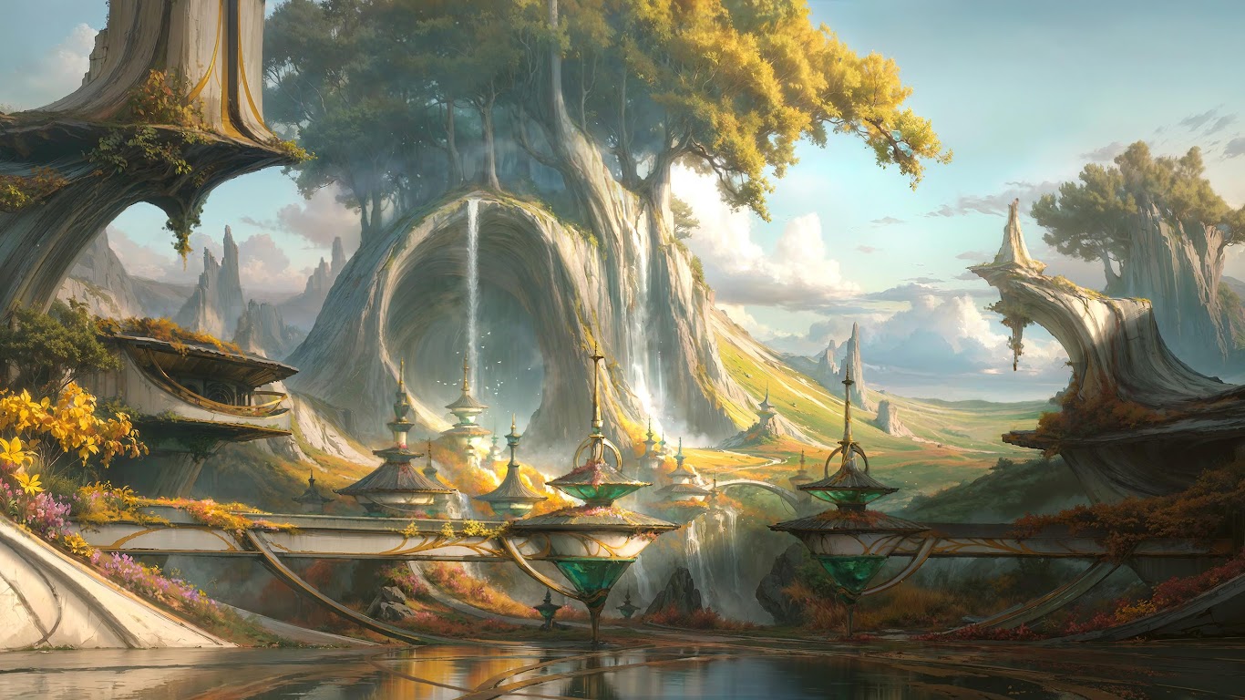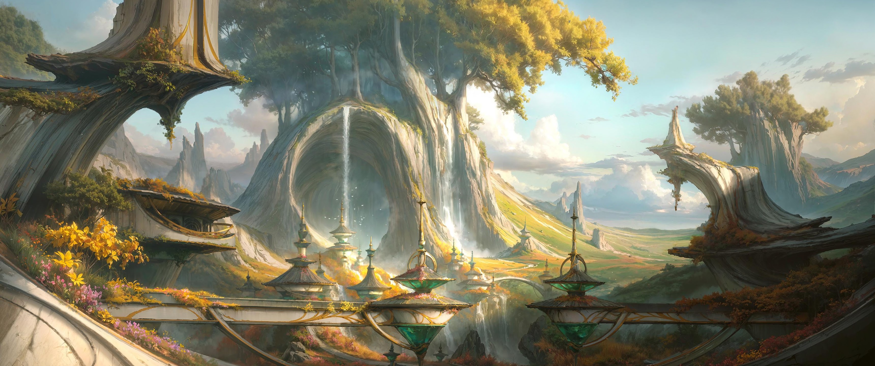 Fantasy Landscape, Waterfall, Utopia, Architecture 2K Desktop and Mobile Wallpaper Background with a maximum resolution of 3451x1679 px.