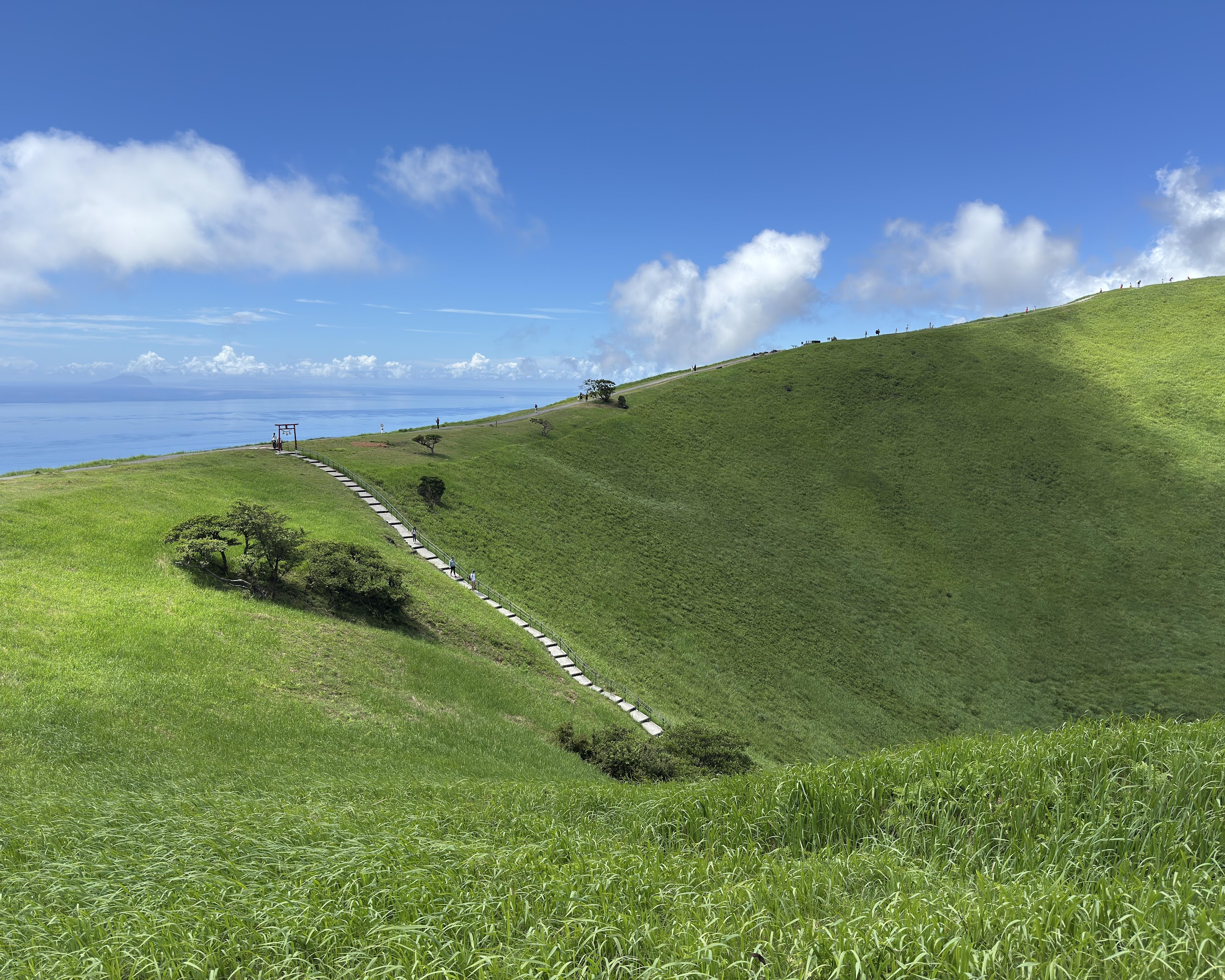 Mountain Scenery, Green Hills, Hiking Trail, Torii Gate 8K Desktop and Mobile Wallpaper Background with a maximum resolution of 8064x6048 px.