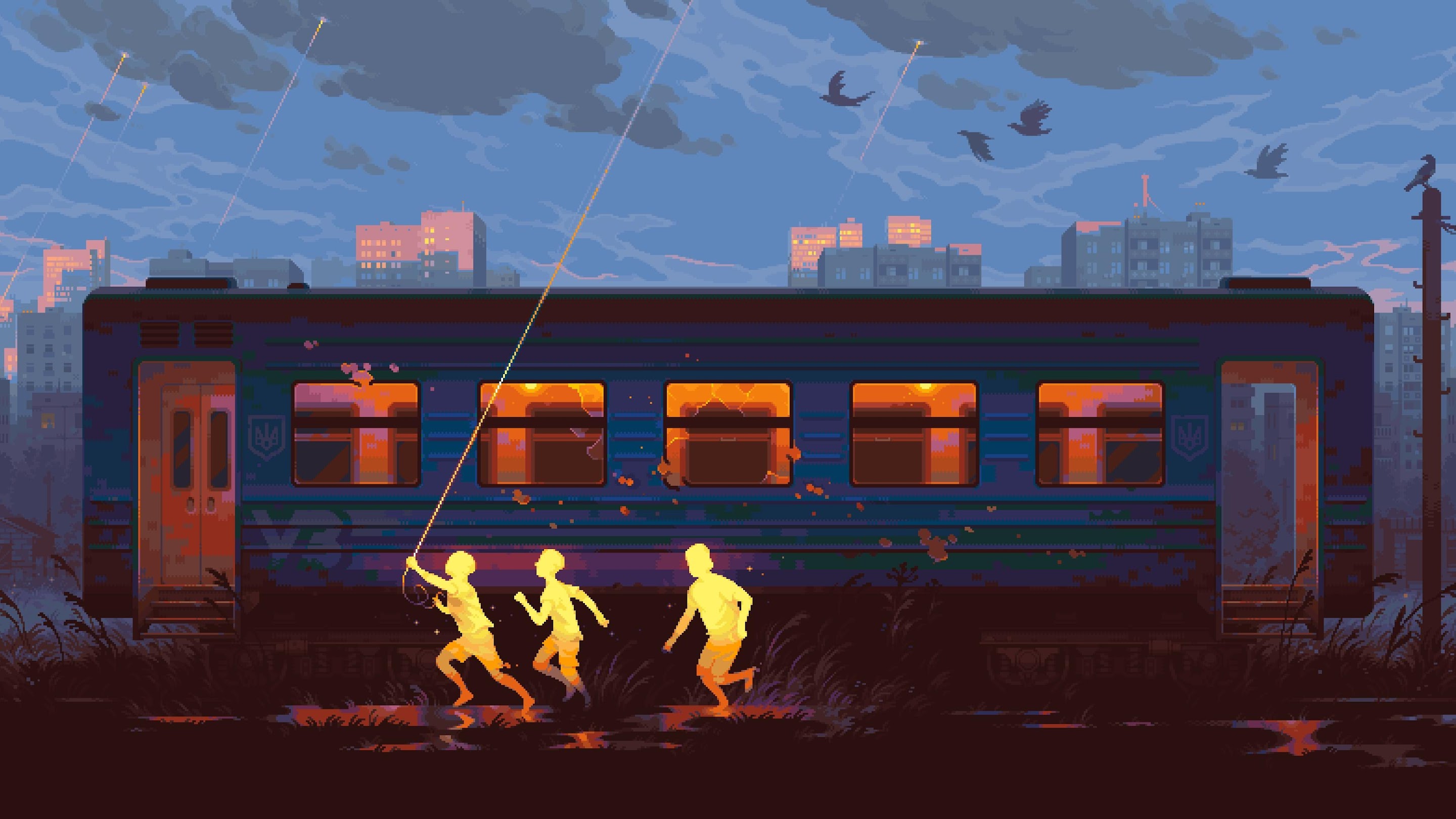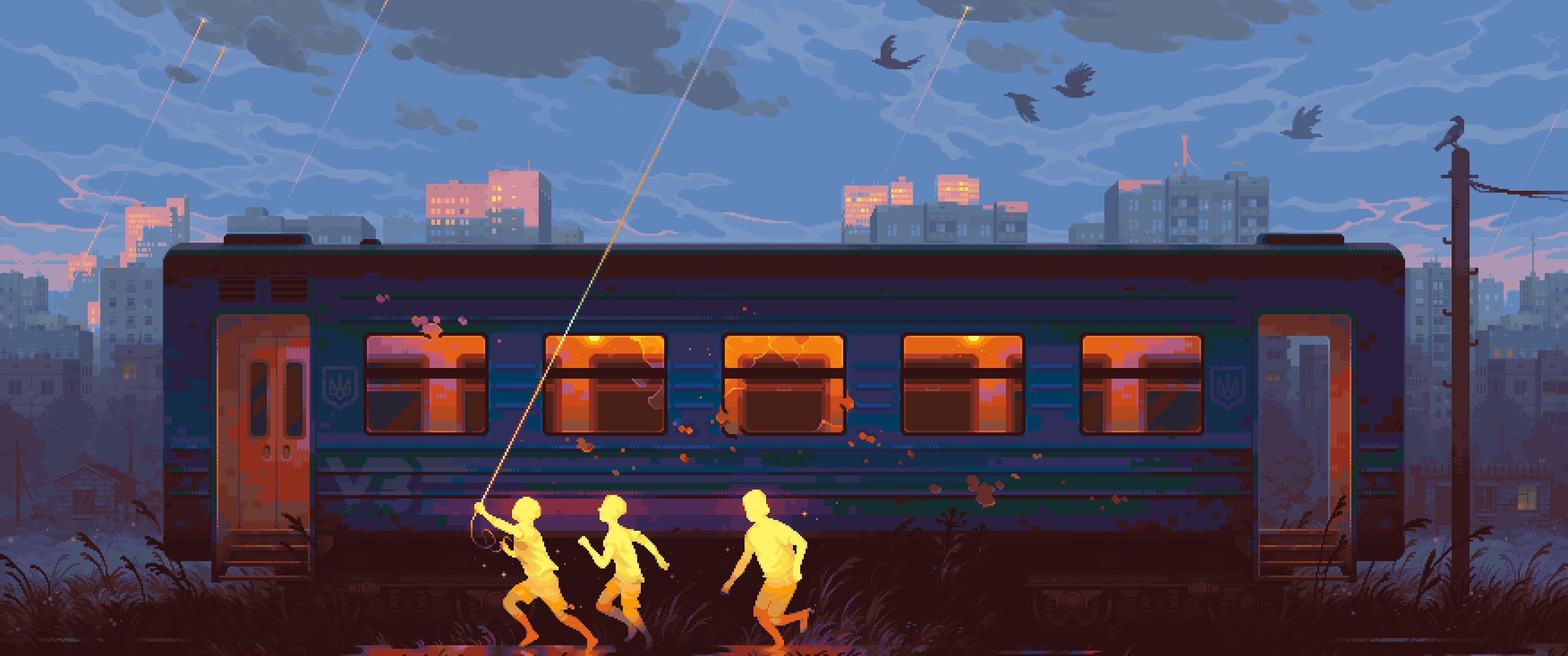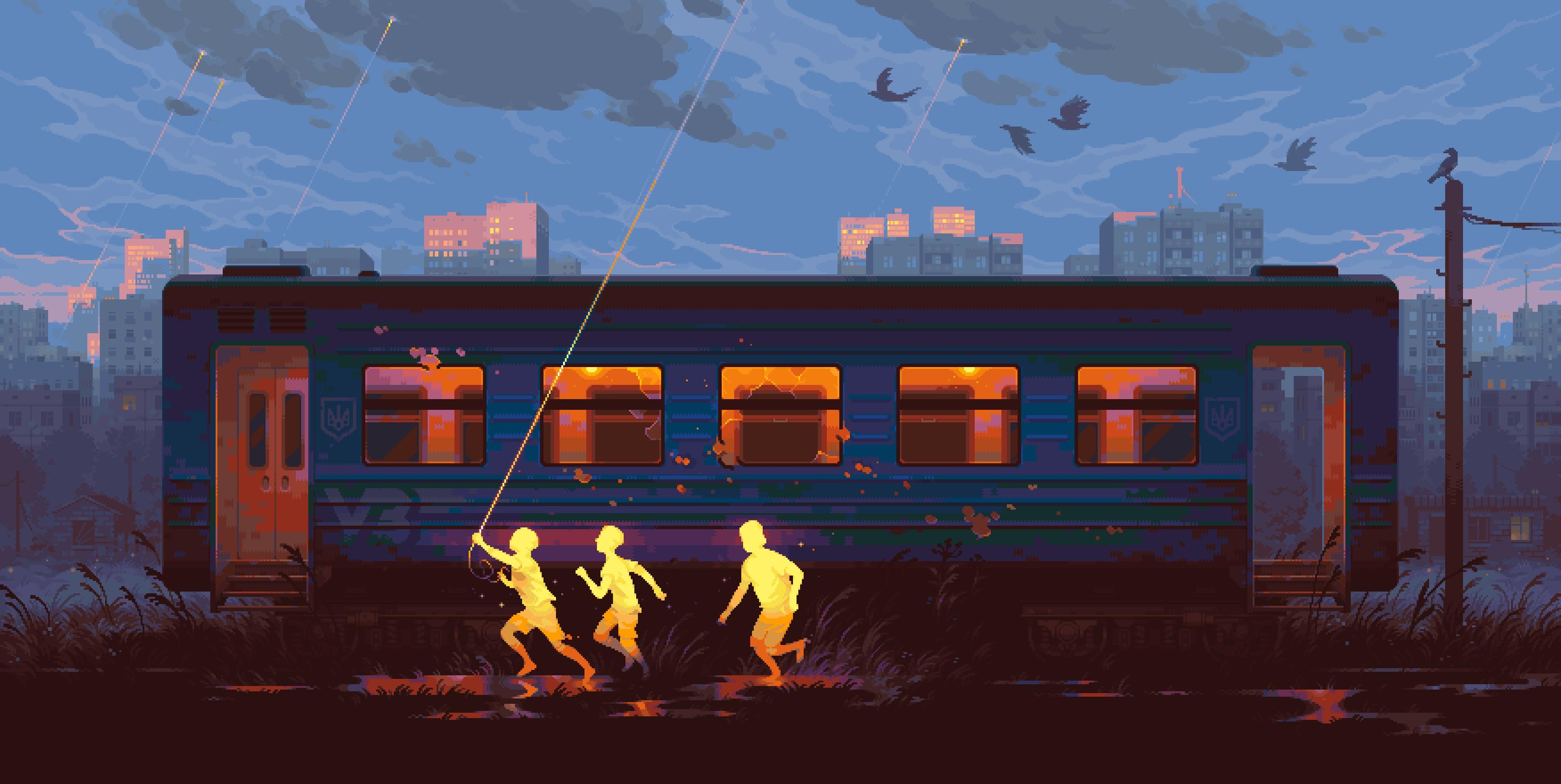 Pixel Art, Train, Children, Evening 2K Desktop and Mobile Wallpaper Background with a maximum resolution of 3504x1760 px.