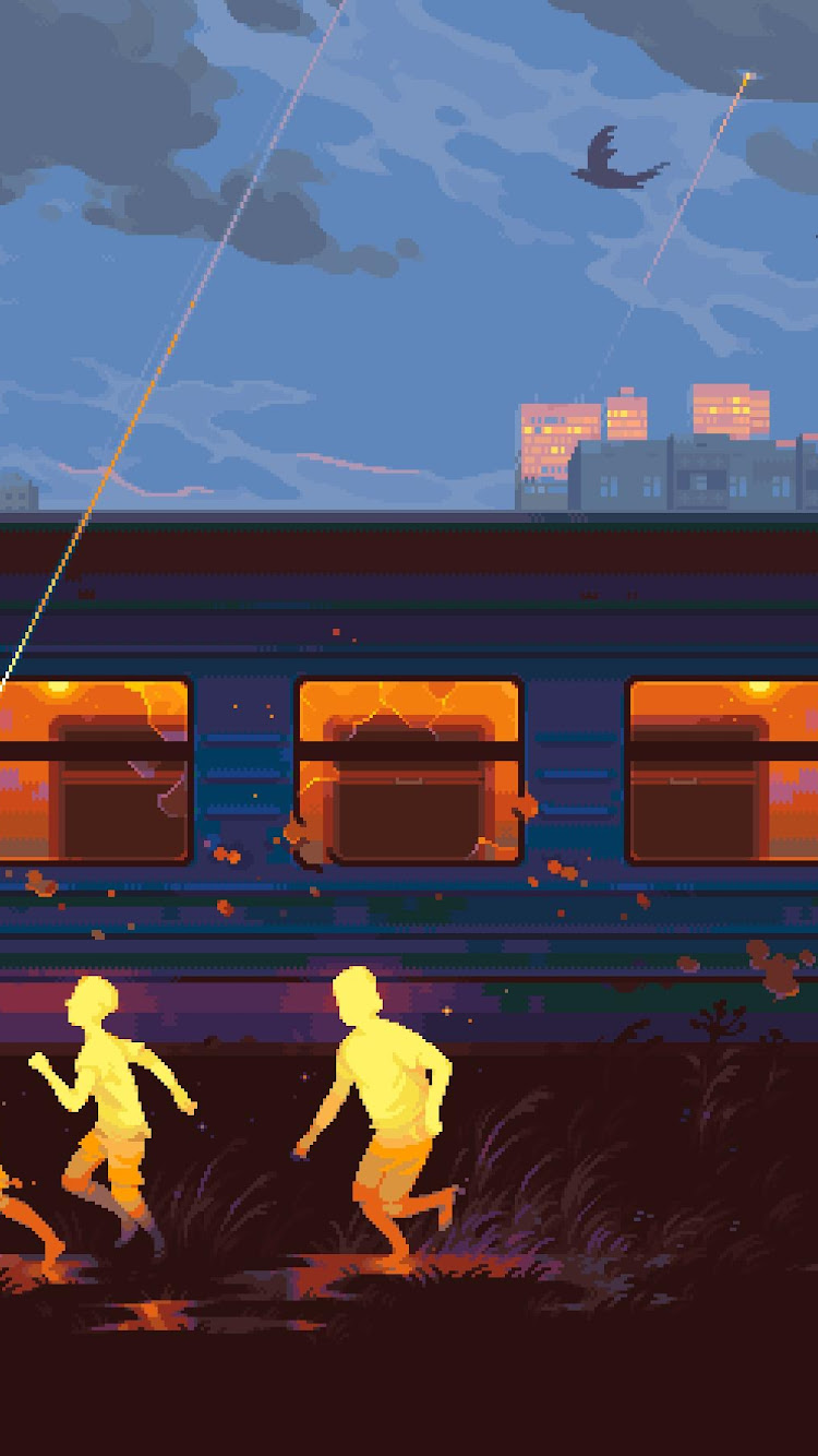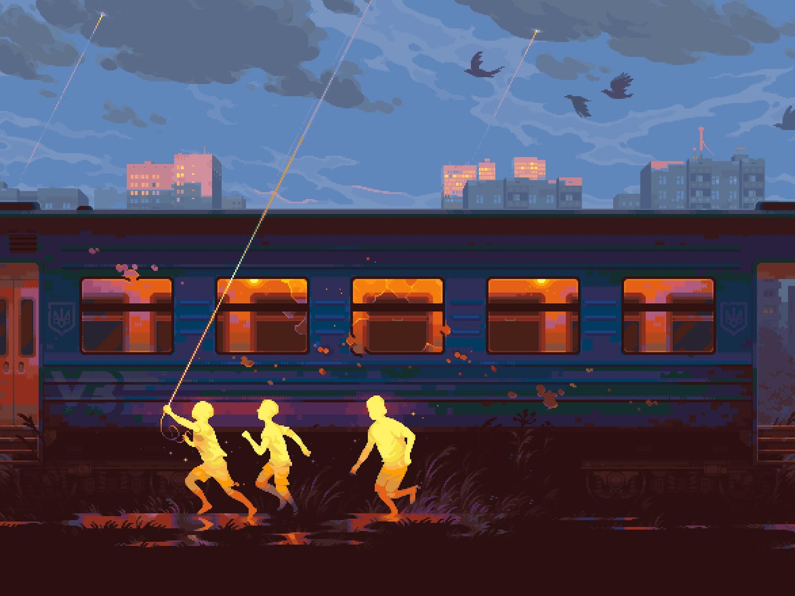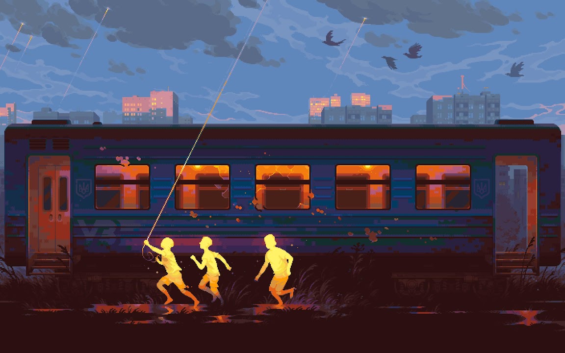 Pixel Art, Train, Children, Evening 2K Desktop and Mobile Wallpaper Background with a maximum resolution of 3504x1760 px.