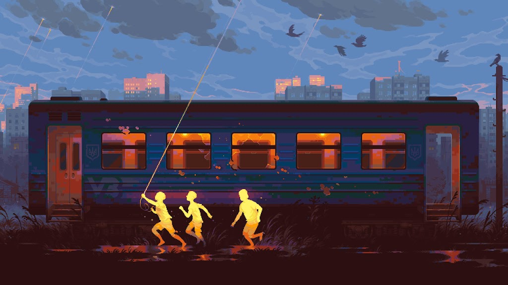 Pixel Art, Train, Children, Evening 2K Desktop Wallpaper