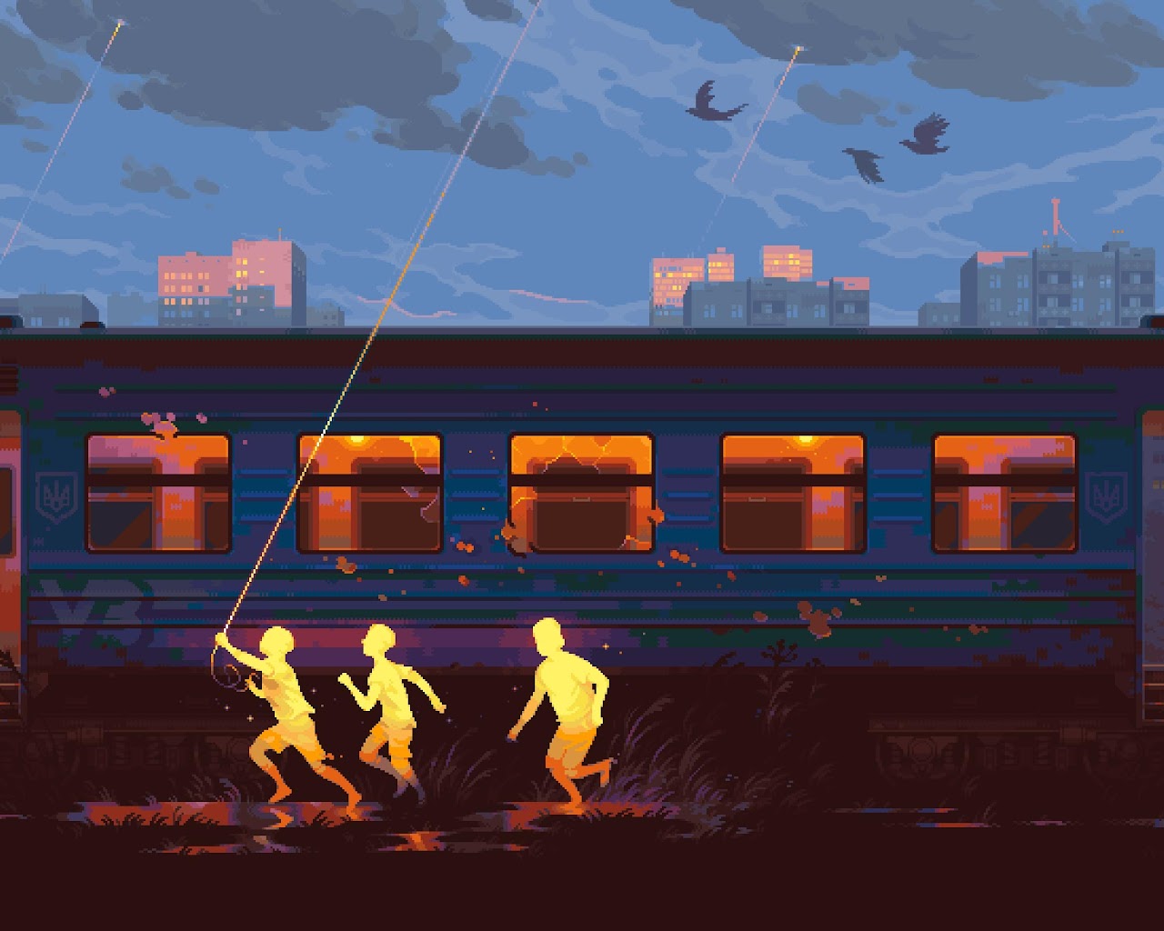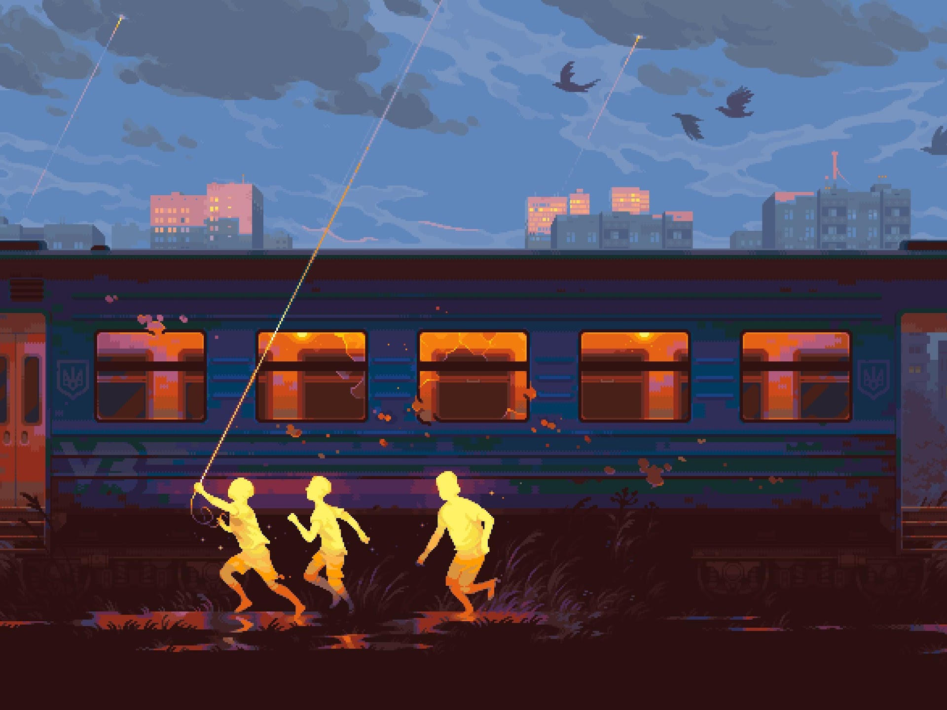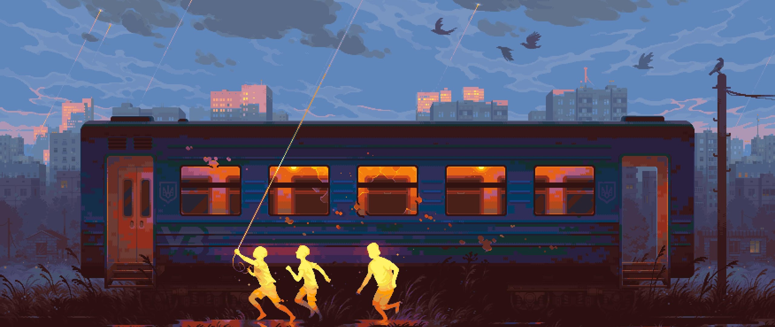 Pixel Art, Train, Children, Evening 2K Desktop and Mobile Wallpaper Background with a maximum resolution of 3504x1760 px.