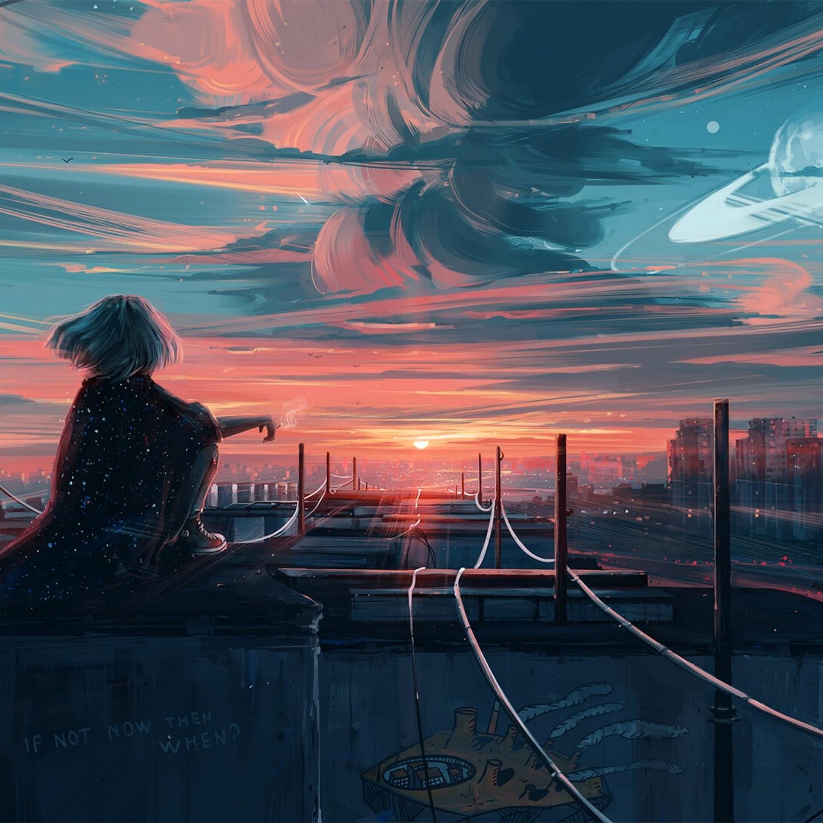 Rooftop View, Sunset Cityscape, Fantasy Art, Alien Encounter 2K Desktop Wallpaper