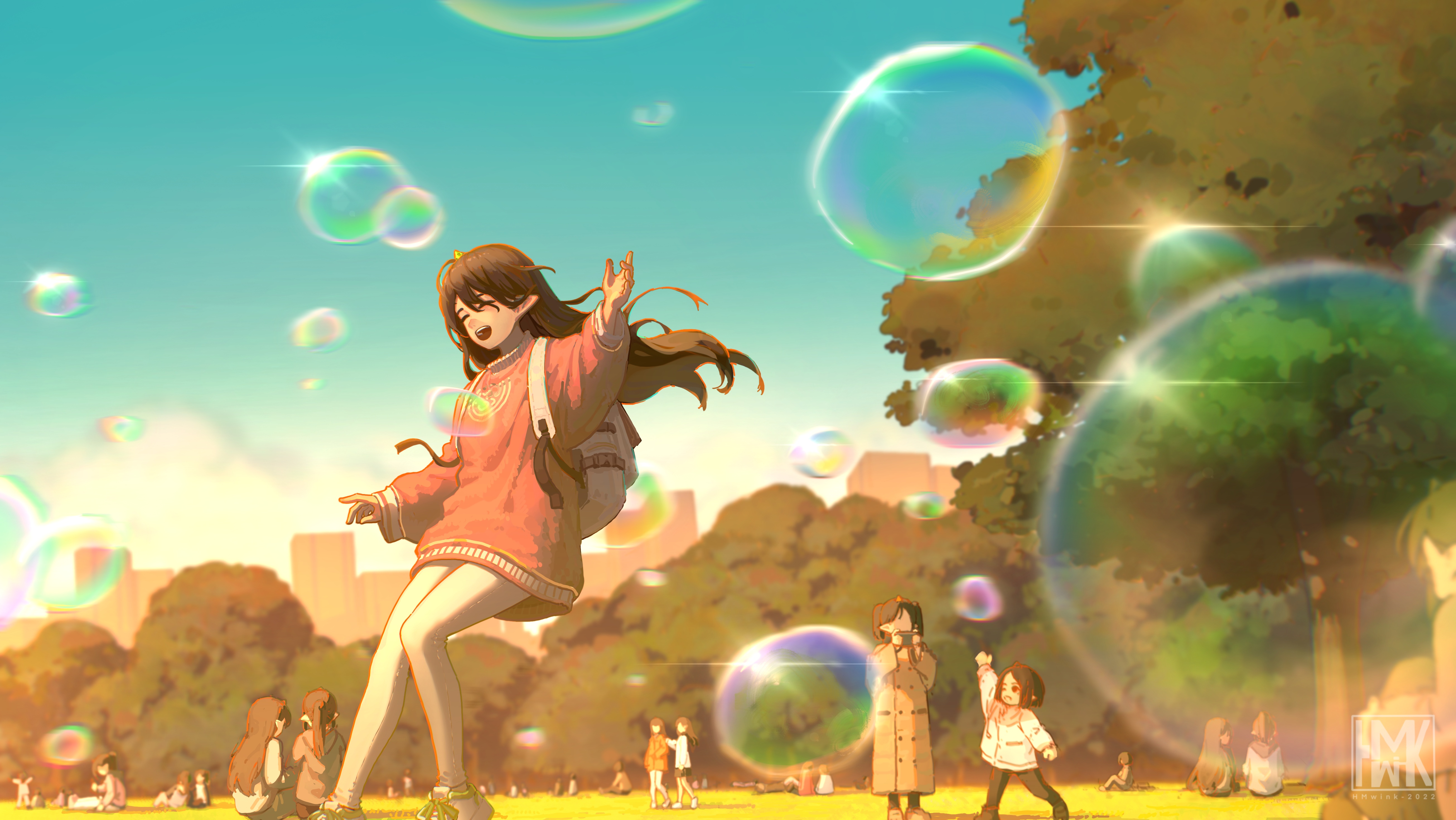 Anime Art, Bubbles, Park, Illustration 5K Desktop and Mobile Wallpaper Background with a maximum resolution of 5221x2941 px.