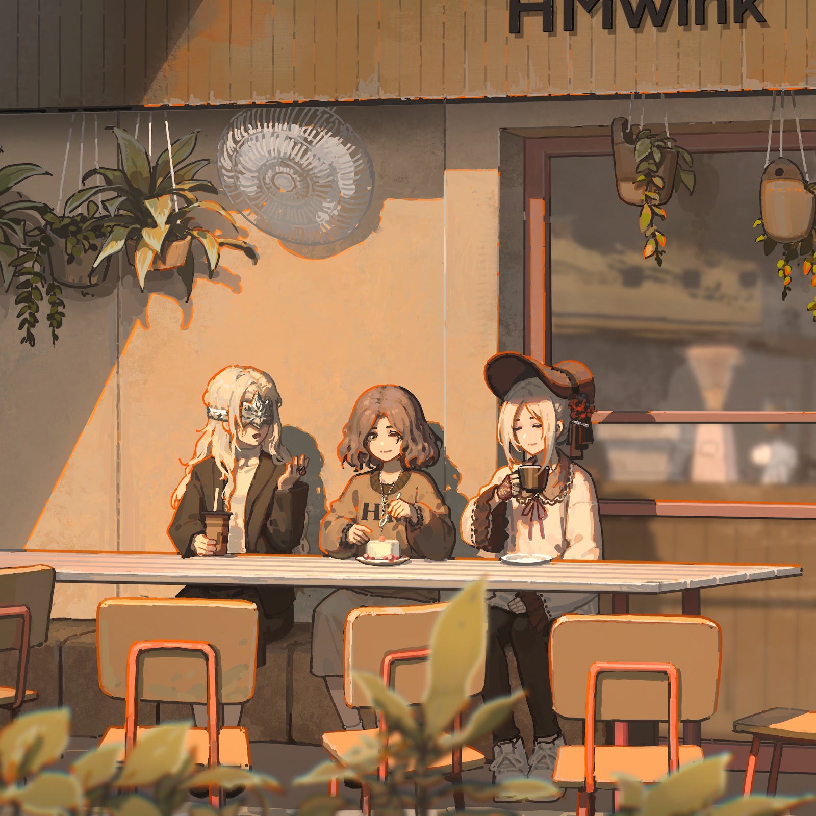 Anime Cafe, Outdoor Seating, Character Illustration, Lifestyle Art 4K Desktop and Mobile Wallpaper Background with a maximum resolution of 5069x2852 px.
