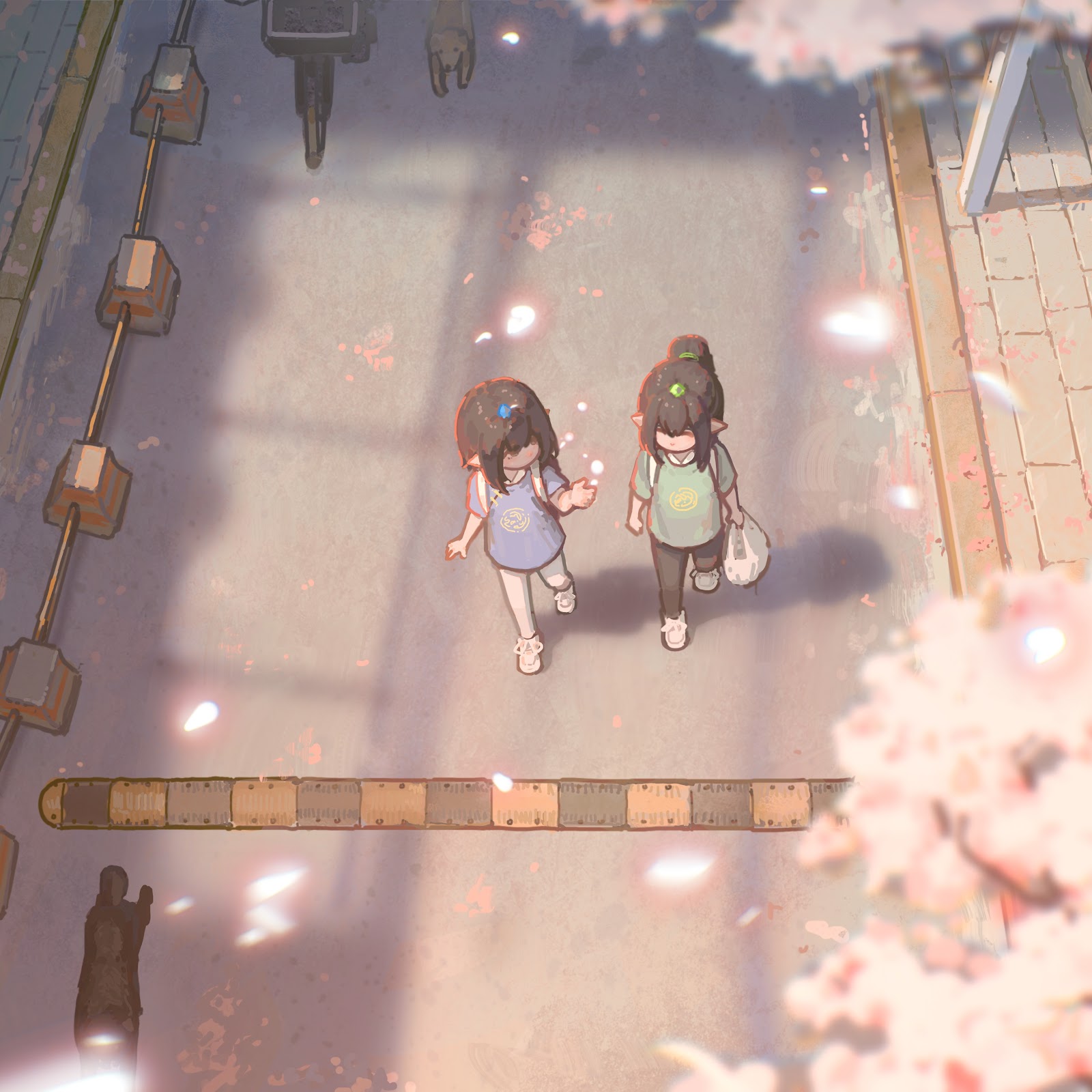 Anime, Cherry Blossoms, Street Scene, Two Girls 5K Desktop and Mobile Wallpaper Background with a maximum resolution of 5273x2967 px.