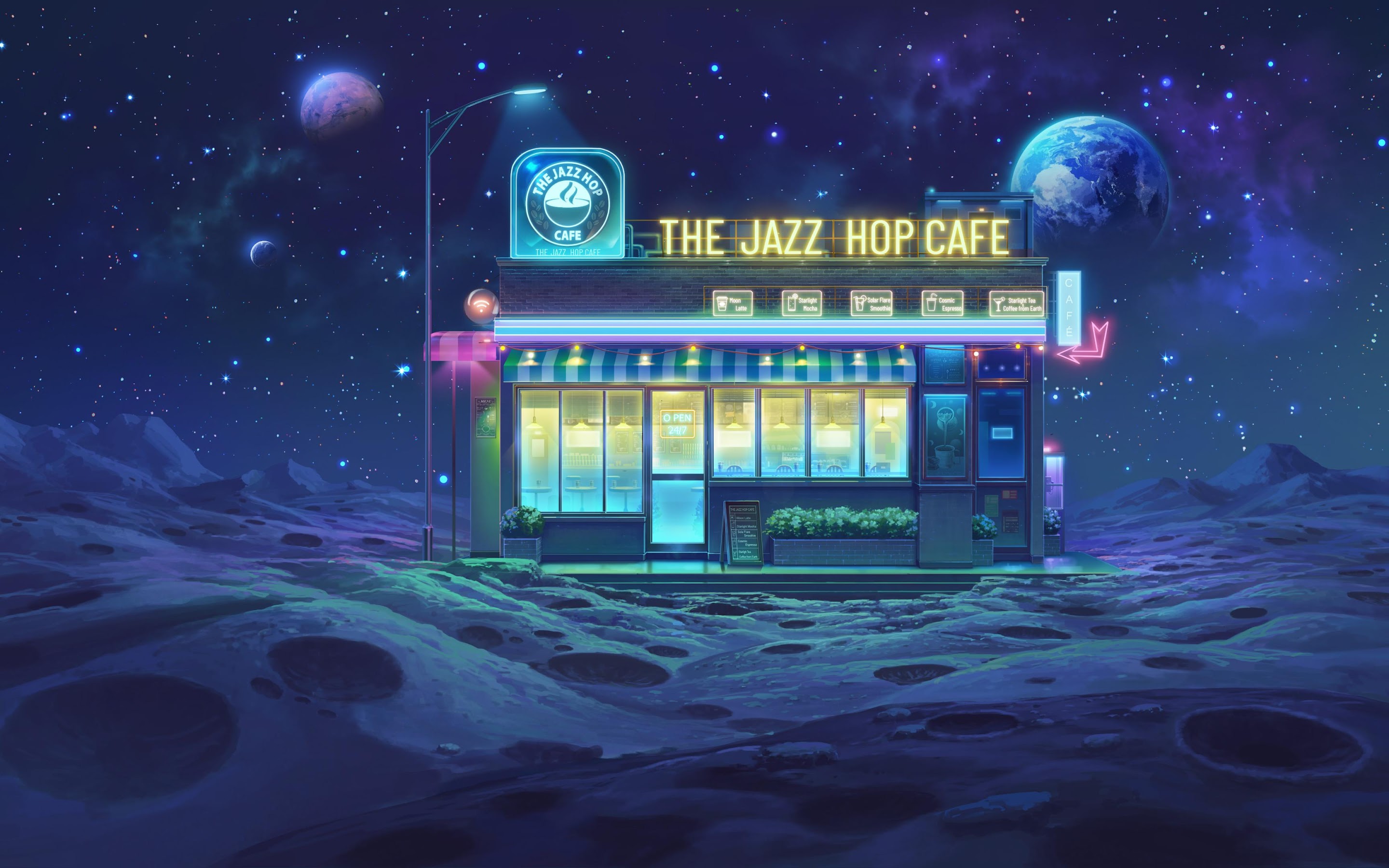 Cafe, Cosmic, Night, Planets 4K Desktop and Mobile Wallpaper Background with a maximum resolution of 3840x2160 px.
