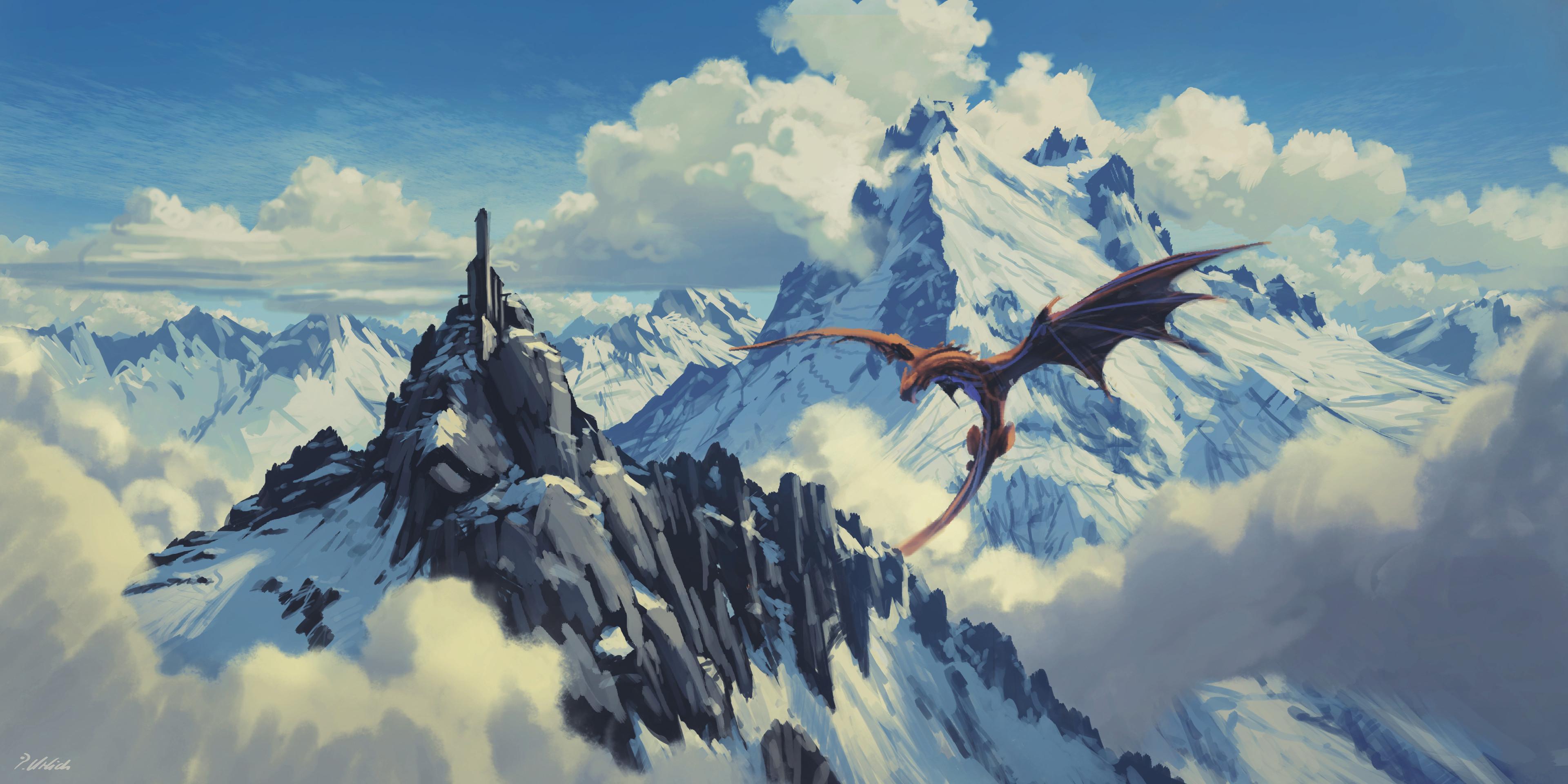 Fantasy Art, Dragon, Mountain Landscape, Digital Painting 2K Desktop and Mobile Wallpaper Background with a maximum resolution of 3840x1920 px.